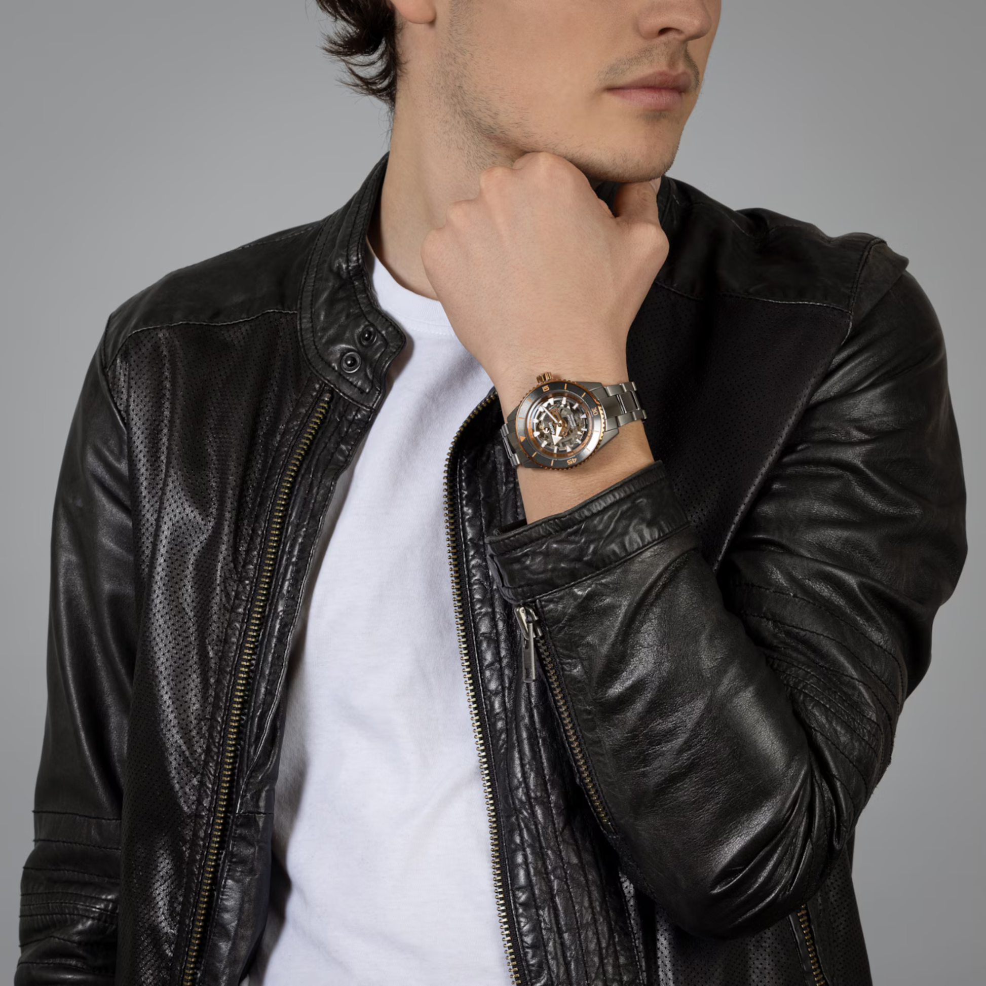 The Captain Cook High-Tech Ceramic Skeleton showcases its innovative R808 movement, a marvel of contrasts, know-how and clever geometry, that allows a distinct view of the various parts. It's equipped with an anti-magnetic and highly reliable NivachronTM hairspring that has been fully tested in five positions and provides up to 80 hours of power reserve. The superb matt-finish monobloc case is framed by a circular-brushed plasma high-tech ceramic bezel insert which matches the tones of the case and the outer bracelet links. Inside the rotatable bezel, a warm and bright rose-gold-coloured index ring adds contrast, next to the box-shaped sapphire crystal with anti-reflective coating on both faces. The dial itself is intentionally spartan, with hands treated with white Super-LumiNova to enhance readability in low-light conditions. Identified by SKU: R32148162.
