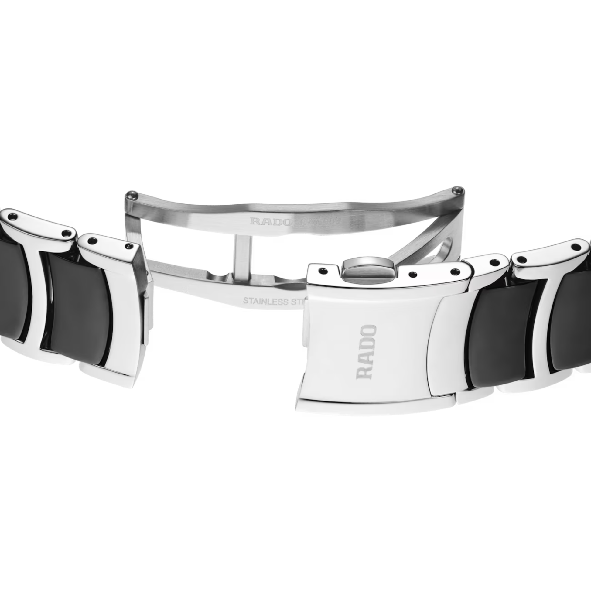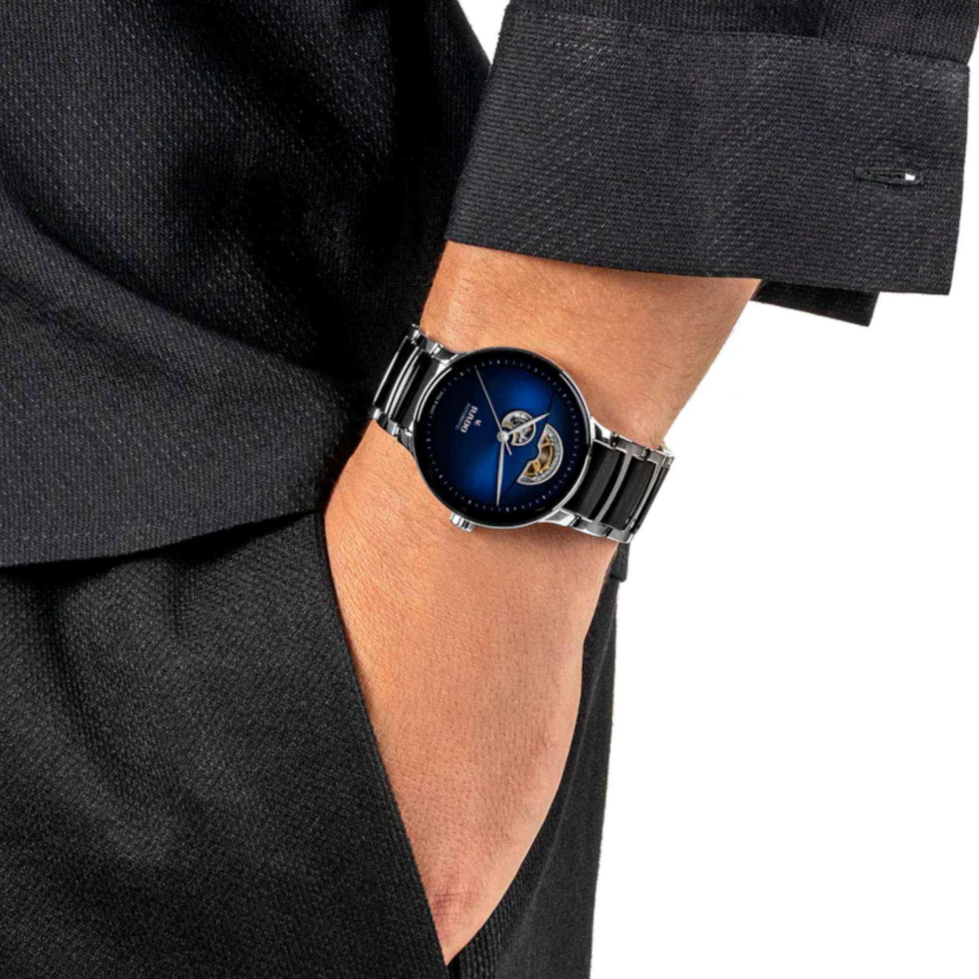 Discover the perfect harmony of innovation and aesthetics with the Rado Centrix Automatic Open Heart. At the heart of this masterpiece beats the Automatic Rado calibre R734 movement, producing impeccable precision and reliability. With an impressive 80-hour power reserve, this watch ensures uninterrupted performance. The antimagnetic Nivachron hairspring and adjustment in five positions further enhance its accuracy. Encased in a polished stainless steel case, measuring a refined 39.5 mm, the Centrix Automatic Open Heart showcases meticulous craftsmanship. The polished stainless steel case back, fitted with a sapphire crystal, offers a glimpse into the mesmerizing inner workings of the watch. The dial exhibits a captivating blue to black gradient, adding depth and allure to the watch's design. Complemented by rhodium coloured hands, the dial ensures excellent legibility and a touch of elegance. The bracelet features polished stainless steel and black high-tech ceramic middle links, creating a striking contrast. Identified by SKU: R30012202.