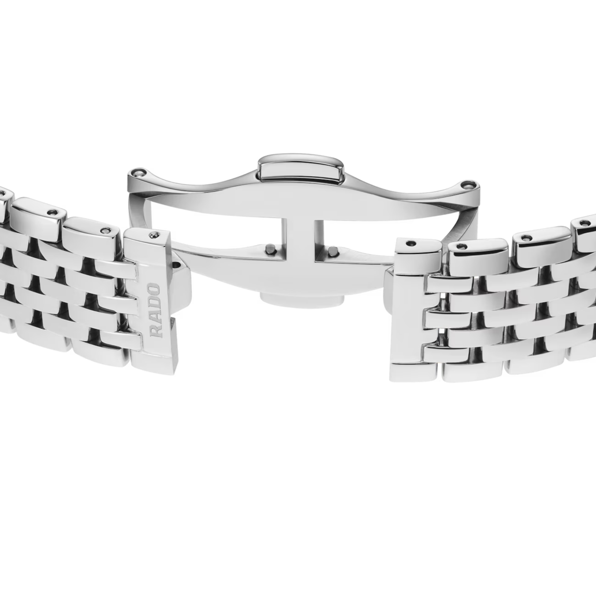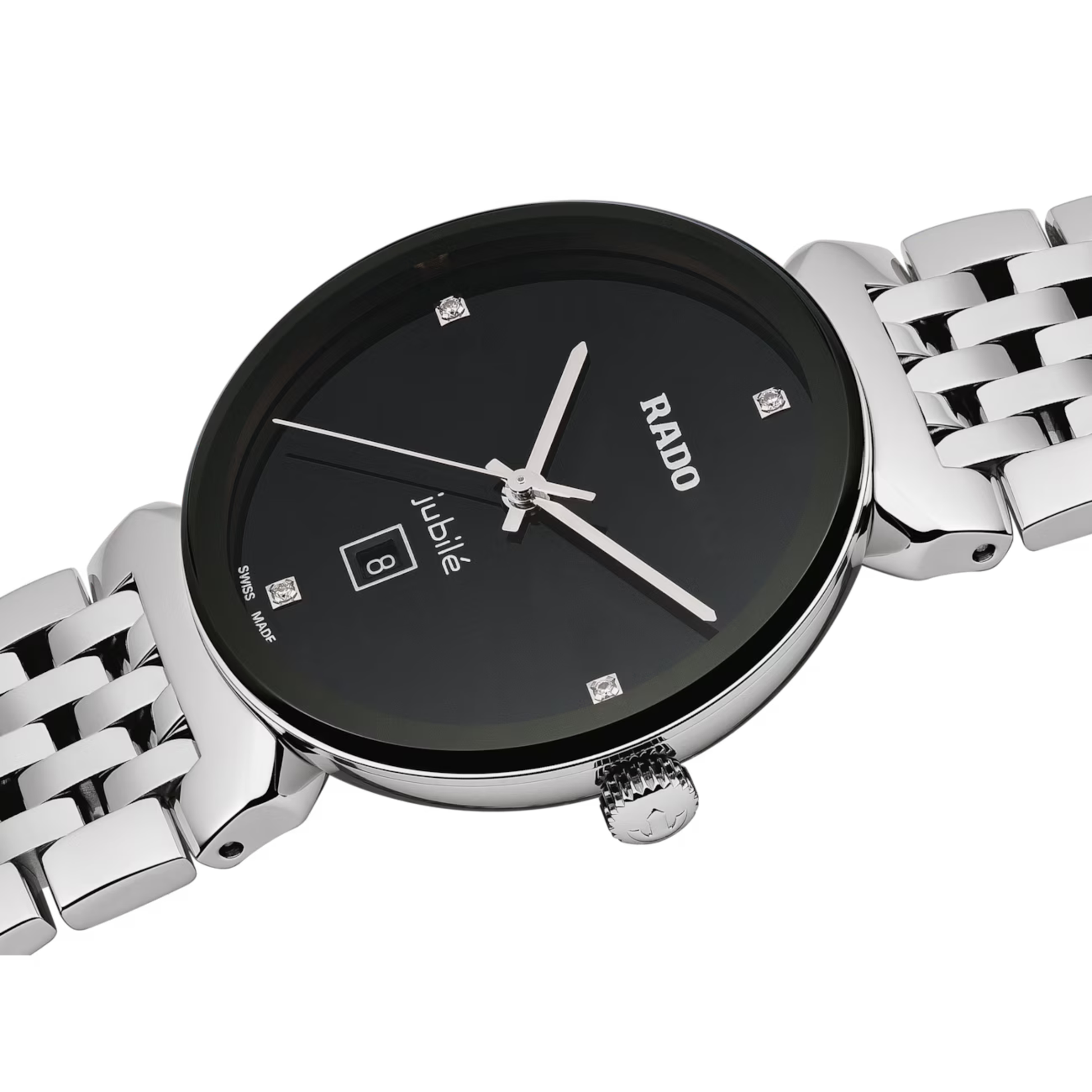 The Rado Florence Diamonds watch embodies timeless elegance, inspired by the architectural beauty of Florence. Featuring a 30mm stainless steel case, a sleek black dial adorned with four full-cut diamonds at 3, 6, 9, and 12 o'clock, and rhodium-plated hands, this Swiss-made timepiece offers precision with its quality quartz movement. The innovative edge-to-edge metalized sapphire crystal enhances durability, making it a refined choice for those who appreciate luxury and sophistication. Identified by SKU: R48913713.