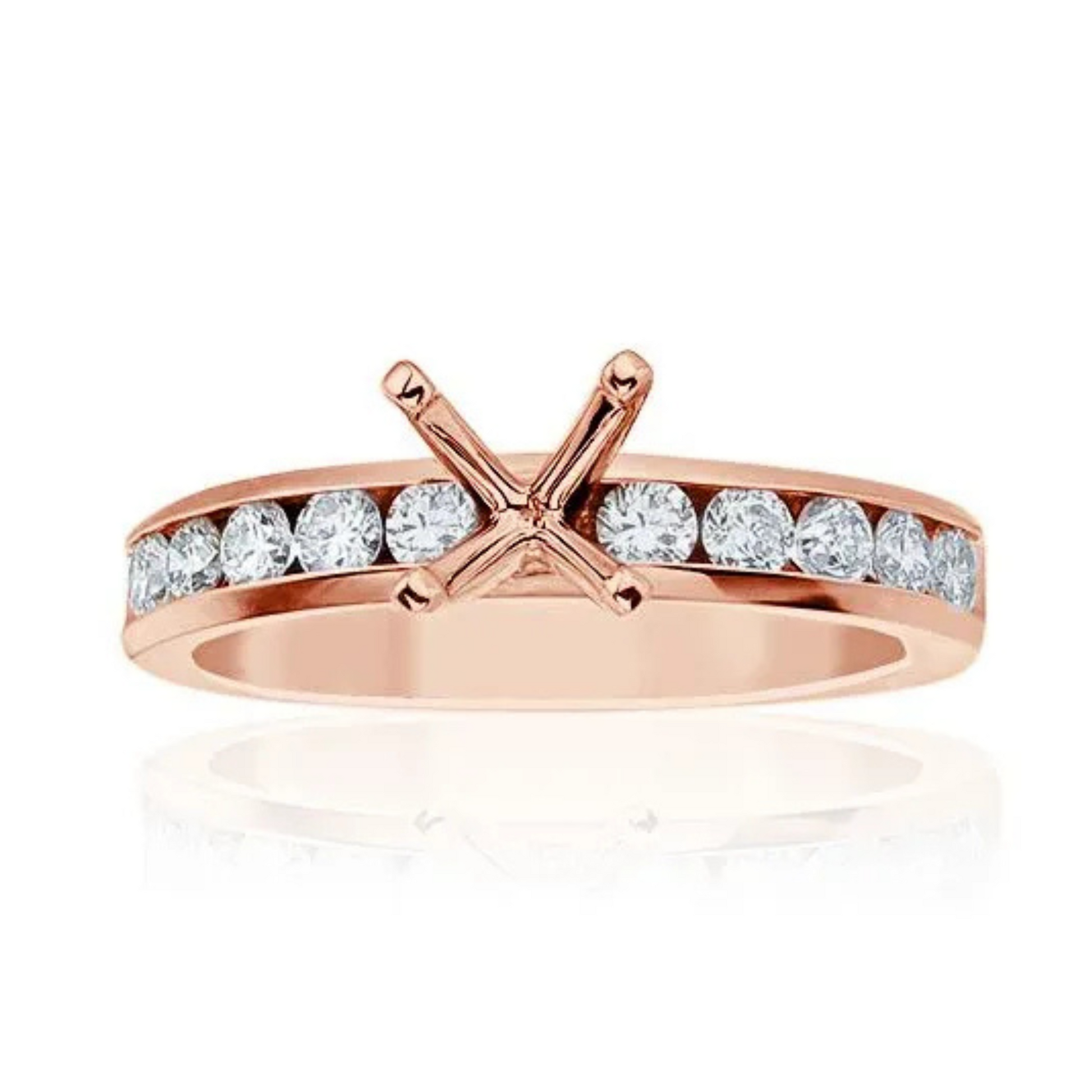 This refined 14K rose gold round diamond channel semi-mount engagement ring setting includes 10 round pavé diamonds totaling 1/2 carat, meticulously set to create a sleek band of continuous brilliance. Designed to perfectly complement the center natural diamond, this setting balances classic elegance with modern appeal. Crafted with ethical natural diamonds, it reflects Imagine Bridal’s commitment to quality and sustainable luxury. A perfect choice for brides seeking understated sparkle and a polished look. Disclaimer: The center diamond is not included and is sold separately.