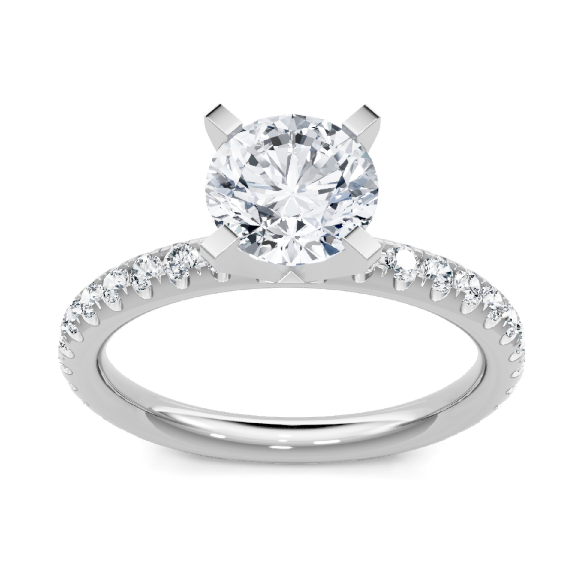 This Imagine Bridal 14K white gold engagement ring features 24 round pavé diamonds totaling 1/2 carat set in a shared prong style semi-mount that wraps 3/4 of the way around the band. The design offers continuous sparkle with a sleek and modern aesthetic, enhancing the center diamond beautifully. Crafted with diamonds, this ring combines ethical luxury with expert craftsmanship. Perfect for brides who desire a sophisticated and radiant engagement ring with a balanced yet eye-catching design. Disclaimer: The center diamond is not included and is sold separately.