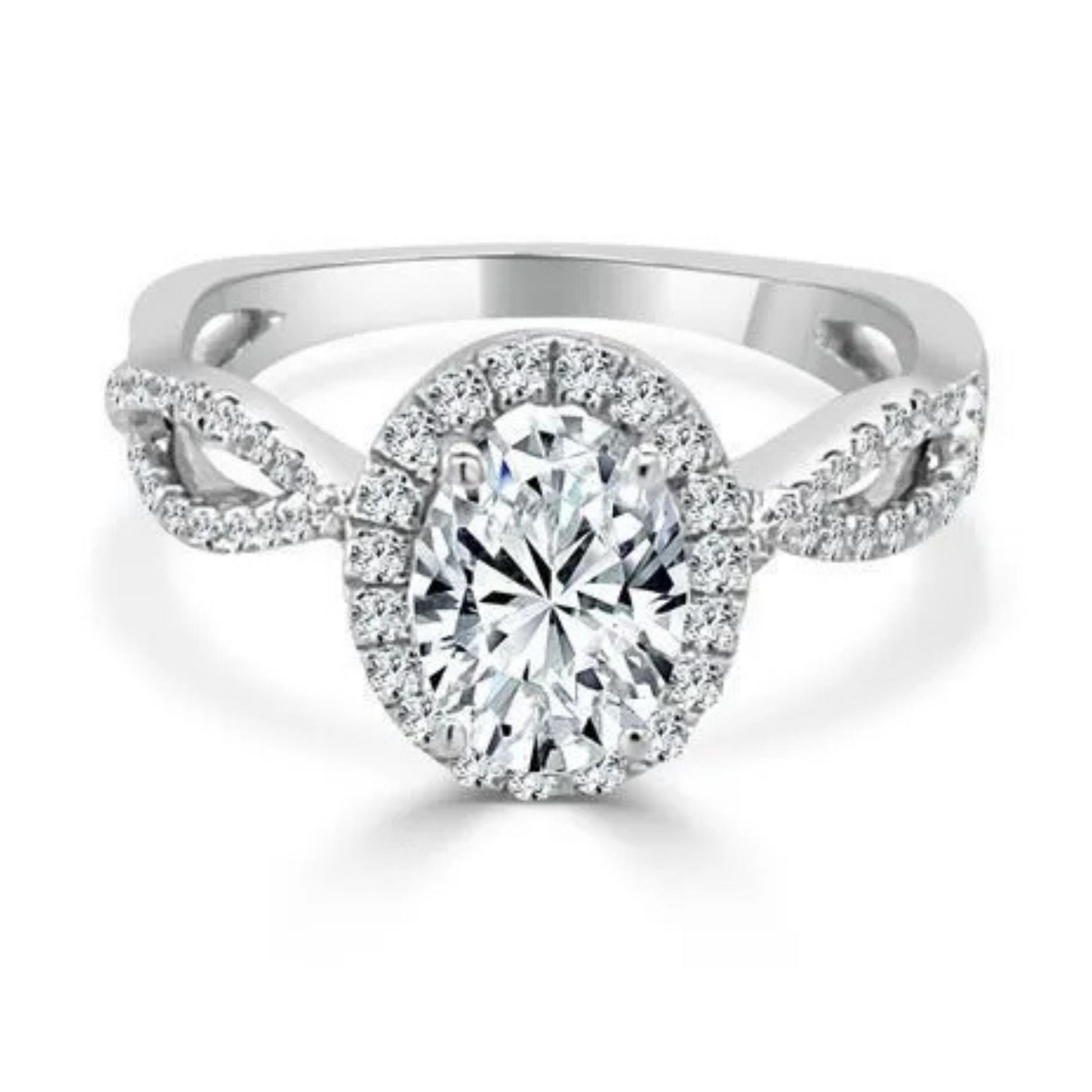 Imagine Bridal’s 14K white gold oval twist halo semi-mount is adorned with 67 round pavé diamonds totaling 1/3 carat, gracefully encircling the center natural diamond. The twist semi-mount adds fluid elegance and enhanced sparkle to the oval shape, offering a fresh take on a timeless design. Crafted sustainably with natural diamonds, this ring balances classic beauty with modern craftsmanship, making it an excellent choice for brides who desire both ethical luxury and captivating brilliance. Disclaimer: The center diamond is not included and is sold separately.