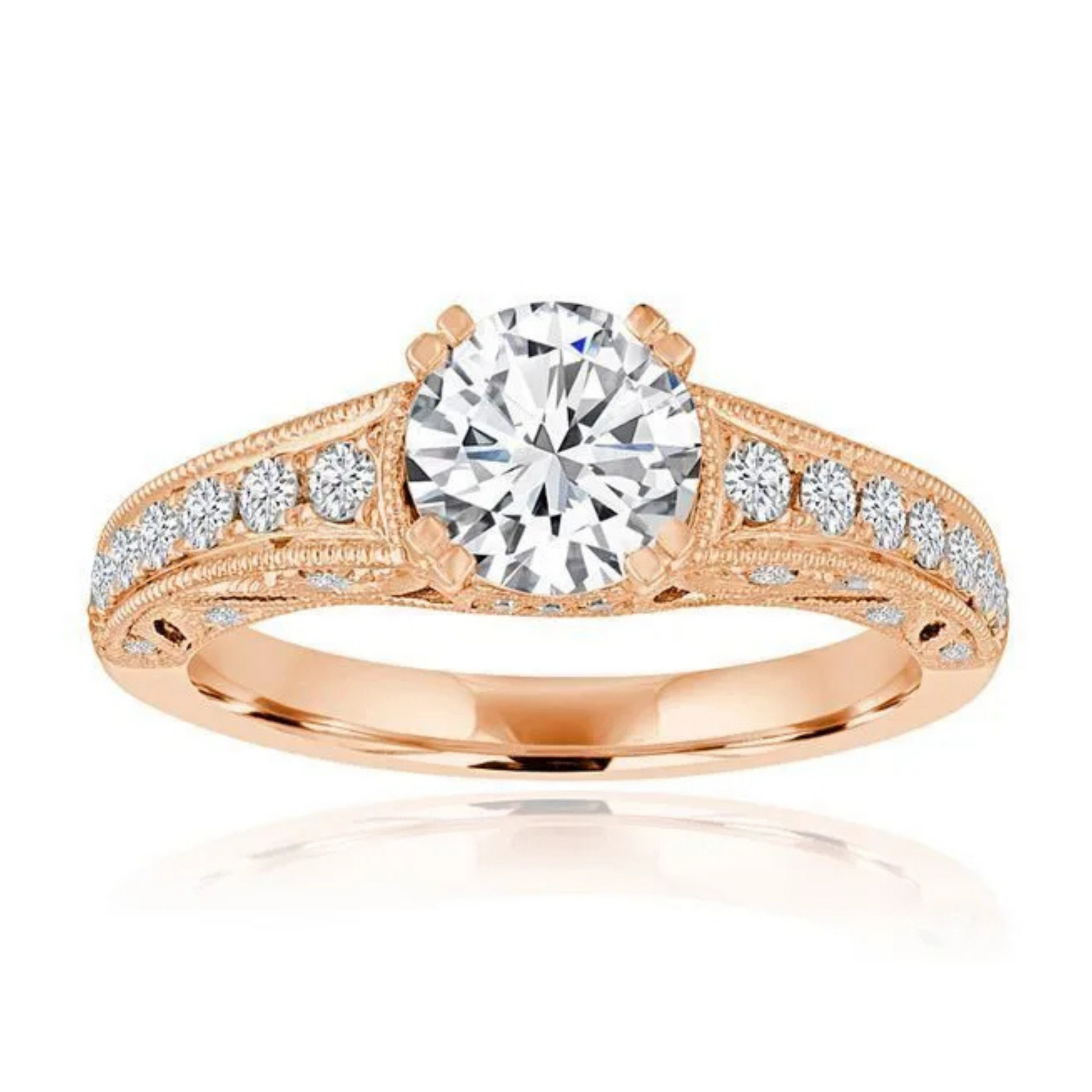 Imagine Bridal presents this delicate 14K rose gold round diamond pave filigree semi-mount engagement ring featuring 32 round pavé diamonds totaling 1/3 carat. The intricate filigree detailing adds vintage sophistication, while the semi-mount setting maximizes sparkle around the center natural diamond. Crafted with ethical natural diamonds, this ring combines timeless elegance with sustainable luxury. Ideal for brides who appreciate craftsmanship and intricate design in a classic yet unique engagement ring. Disclaimer: The center diamond is not included and is sold separately.