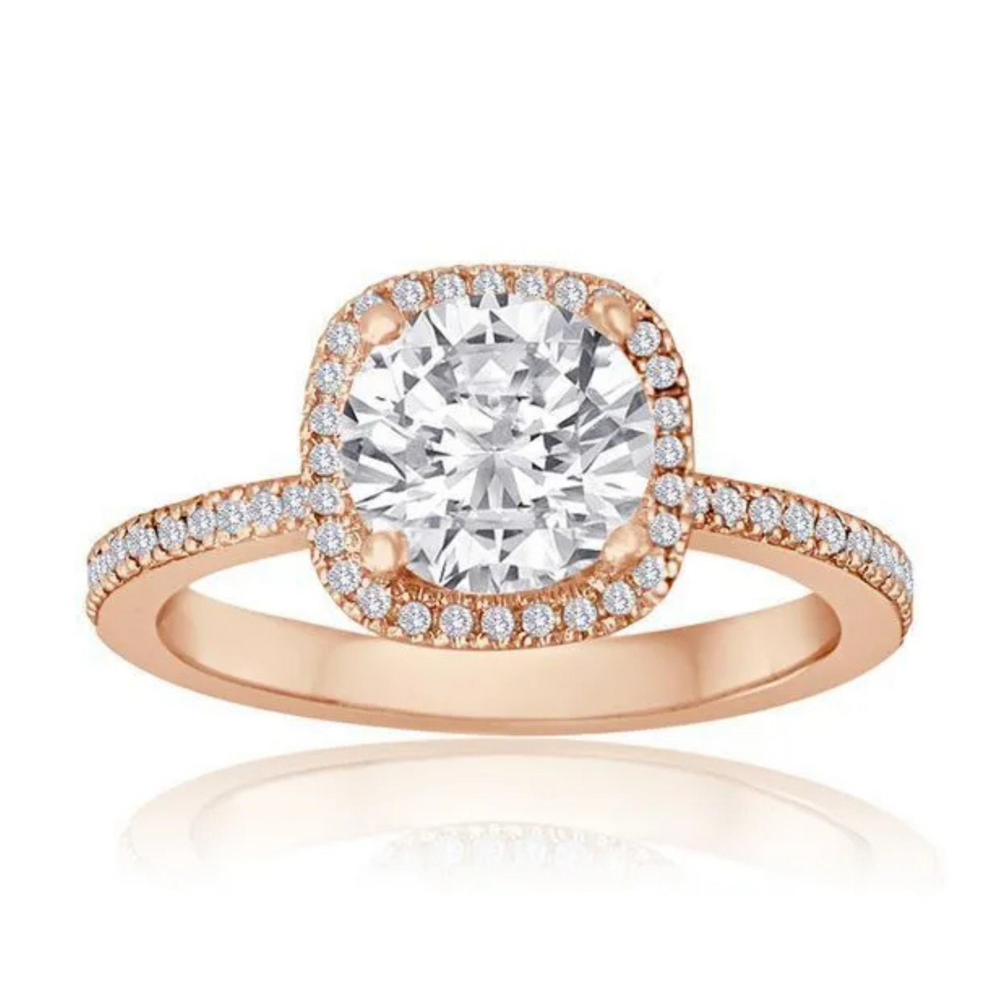 This elegant 14K rose gold round diamond pave cushion semi-mount engagement ring features 64 round pavé diamonds totaling 1/4 carat, artfully arranged around a cushion-shaped center natural diamond. The pave cushion semi-mount enhances the stone’s brilliance, creating a radiant and classic look. Crafted sustainably with natural diamonds, this ring reflects Imagine Bridal’s dedication to ethical craftsmanship and refined style. It’s perfect for brides seeking a timeless engagement ring with a touch of modern sparkle and lasting beauty. Disclaimer: The center diamond is not included and is sold separately.