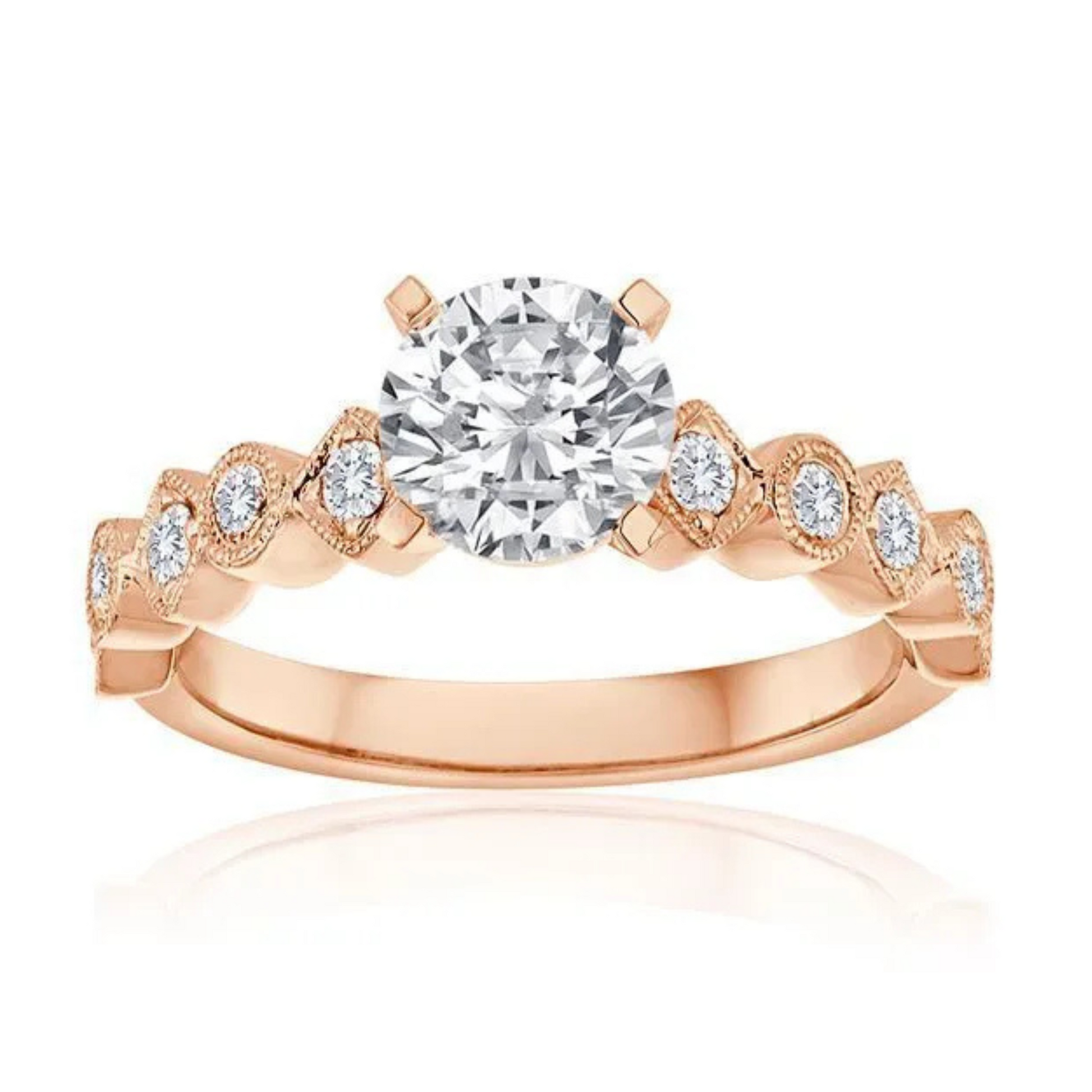 With 10 round pavé diamonds totaling 1/4 carat, this 14K rose gold milgrain pave band offers a charming vintage-inspired look. The milgrain edging adds delicate texture while accentuating the sparkle of the natural diamonds and their semi-mount mounting. Crafted by Imagine Bridal, this engagement ring combines sustainable luxury with classic detailing, making it ideal for brides who appreciate elegant design rooted in tradition and responsible sourcing. Disclaimer: The center diamond is not included and is sold separately.