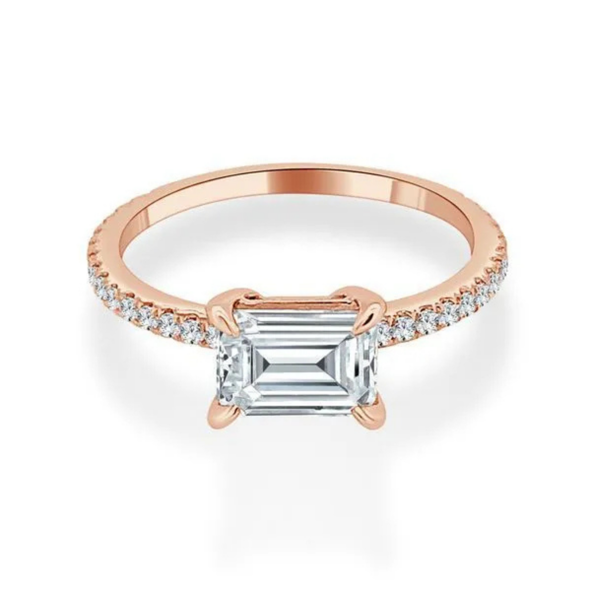 Imagine Bridal’s 14K white gold east-west emerald cut semi-mount is accented with 32 round pavé diamonds totaling 1/4 carat. This unique horizontal setting highlights the elongated emerald-cut center diamond, creating a contemporary and sophisticated look. Crafted with sustainable diamonds, this piece offers a fresh take on classic elegance. Perfect for brides seeking a distinctive and stylish engagement ring that combines ethical sourcing with exceptional design. Disclaimer: The center diamond is not included and is sold separately.
