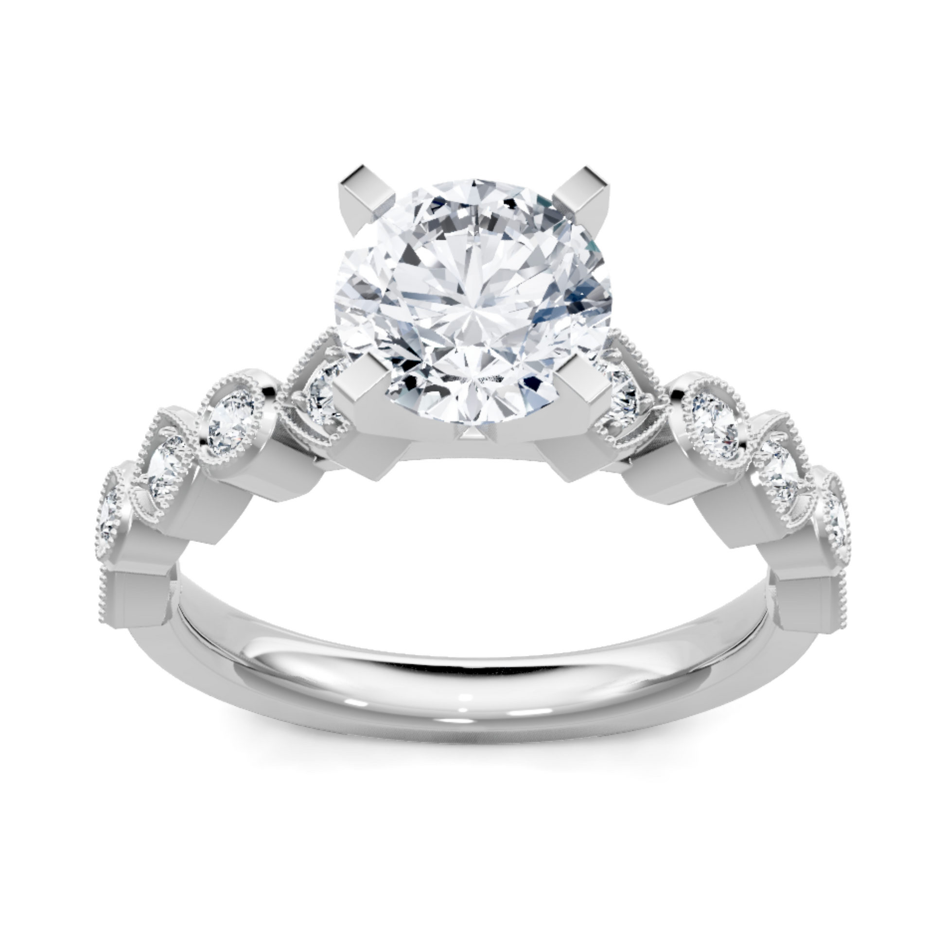 With 10 round pavé diamonds totaling 1/4 carat, this 14K white gold milgrain pave band offers a charming vintage-inspired look. The milgrain edging adds delicate texture while accentuating the sparkle of the diamonds and the semi-mount setting. Crafted by Imagine Bridal, this engagement ring combines luxury with classic detailing, making it ideal for brides who appreciate elegant design rooted in tradition and responsible sourcing. Disclaimer: The center diamond is not included and is sold separately.