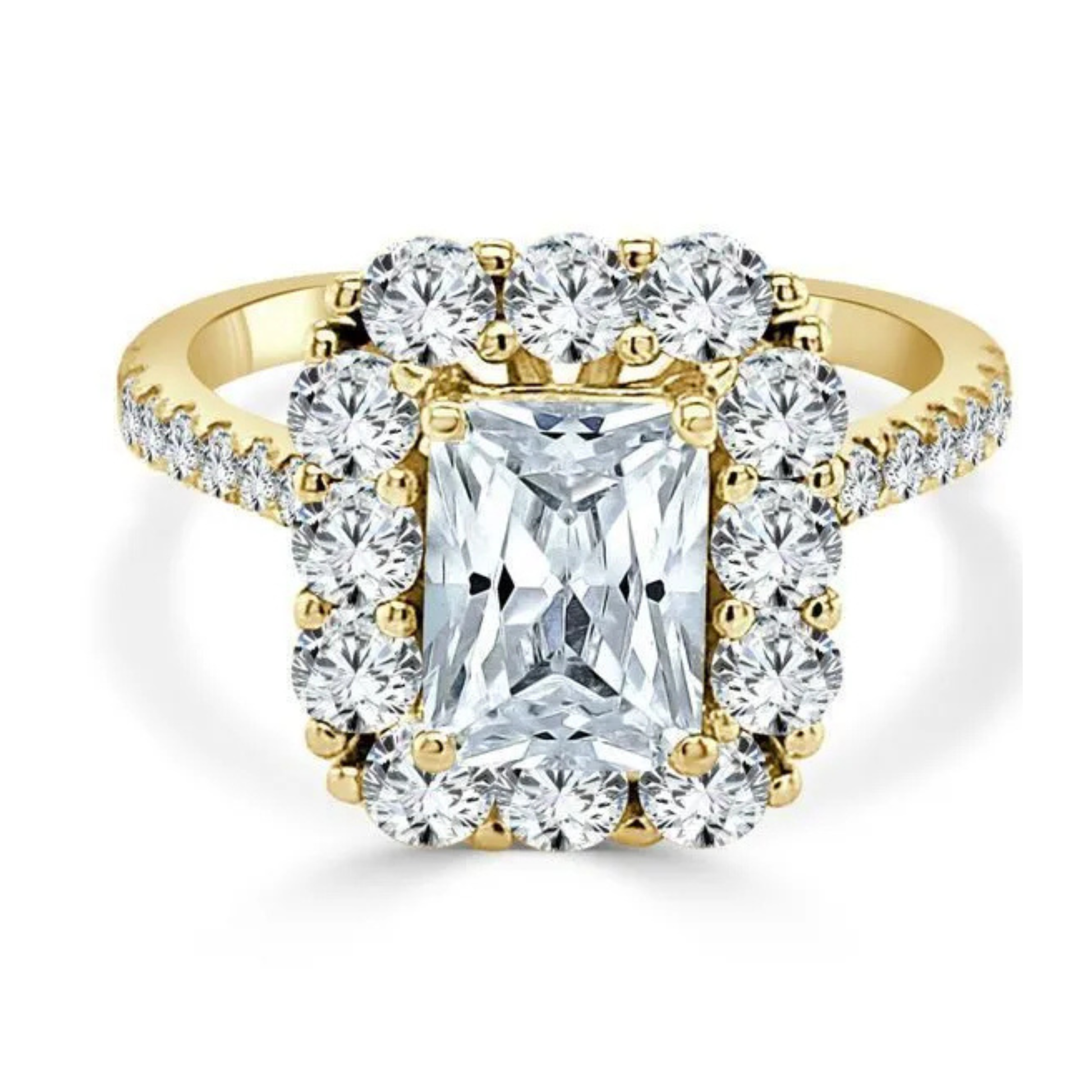 Imagine Bridal’s 14K yellow gold emerald cut semi-mount features 28 round pavé diamonds totaling 1 carat surrounding the center stone in a semi-mount setting. This design enhances the emerald cut’s classic elegance with sparkling detail, adding brilliance and dimension. Crafted with natural diamonds, it offers a sustainable and luxurious choice for brides wanting a refined and radiant engagement ring base. The semi mount allows personalization while highlighting the beauty of the emerald cut center diamond. Disclaimer: The center diamond is not included and is sold separately.