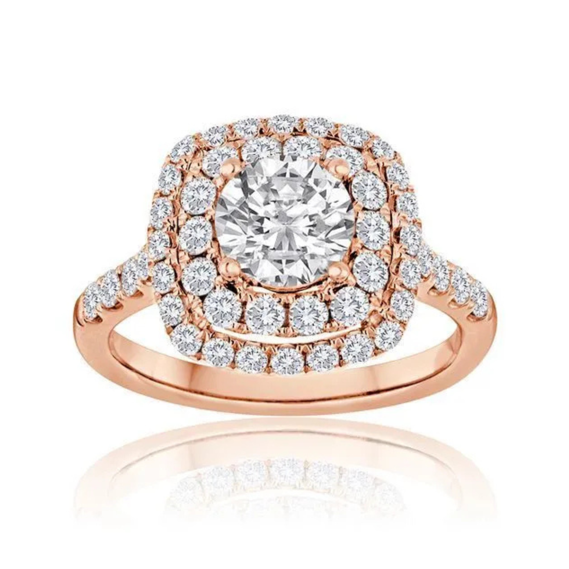 Imagine Bridal presents this stunning 14K rose gold engagement ring featuring a 1 Ct round center diamond surrounded by a cushion-shaped semi-mount of 46 pavé diamonds. The semi-mount amplifies the center stone’s brilliance and adds depth and dimension to the design. Crafted with ethical natural diamonds, this ring balances bold glamour with responsible luxury. Ideal for brides who want maximum sparkle and a statement-making piece, this cushion semi-mount ring perfectly blends timeless elegance with contemporary style. Disclaimer: The center diamond is not included and is sold separately.