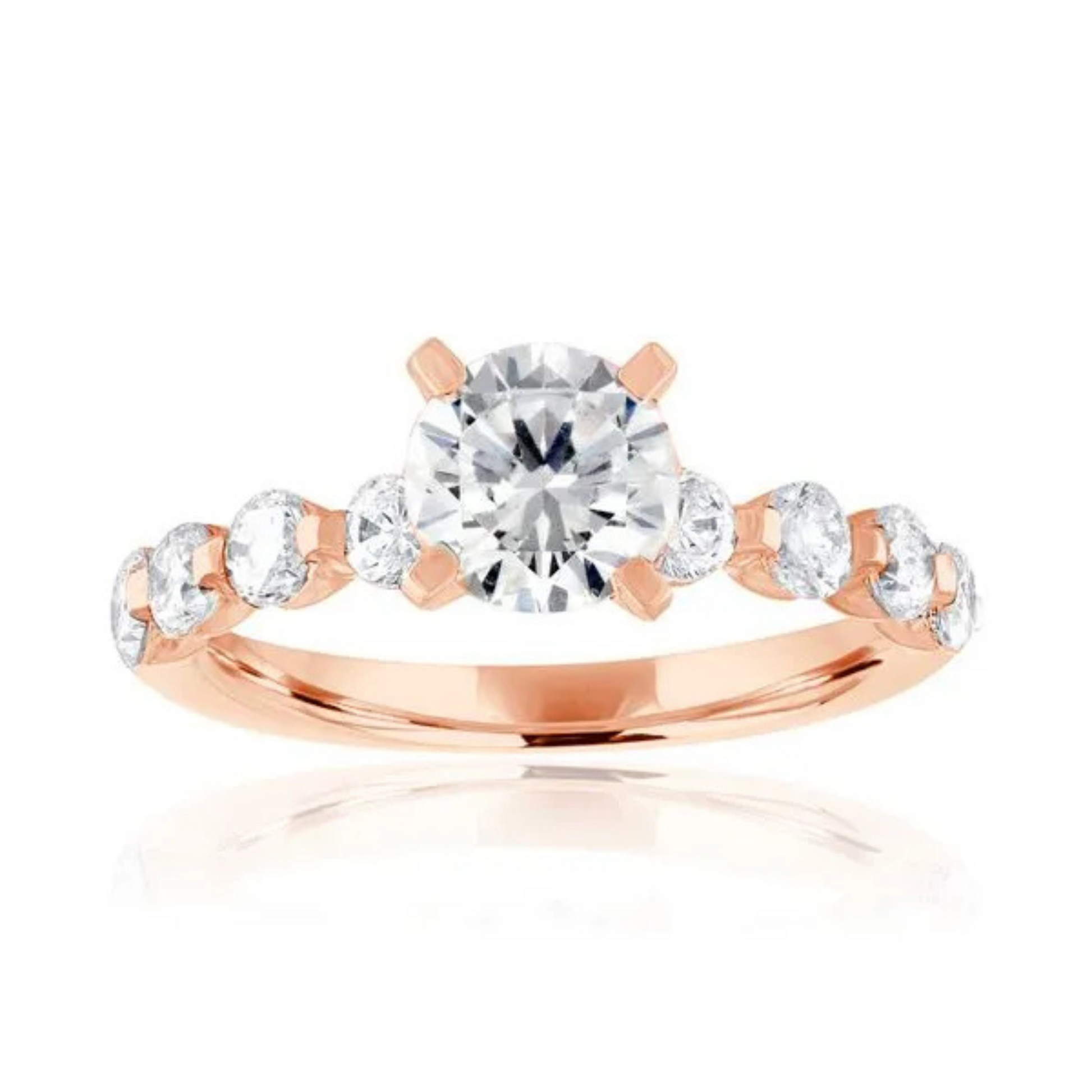 Imagine Bridal’s 14K rose gold round diamond semi-mount engagement ring features 8 round pavé diamonds totaling 1 carat, intricately set to enhance the center natural diamond’s radiance. The semi-mount setting offers a unique combination of elegance and sparkle, showcasing expert craftsmanship and ethical sourcing. This ring is perfect for brides who desire a contemporary, luminous design that highlights the brilliance of their center stone with sustainable luxury and refined style. Disclaimer: The center diamond is not included and is sold separately.