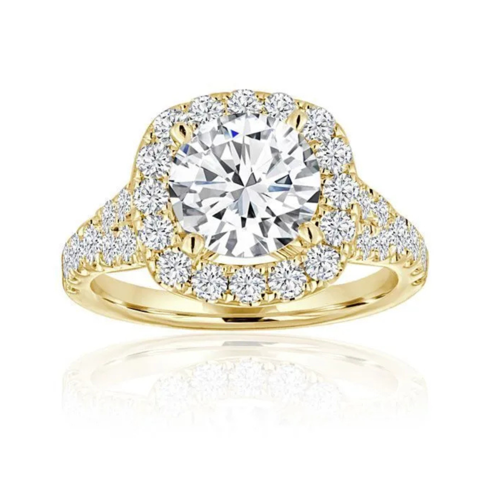 This exquisite 14K yellow gold engagement ring features a round pavé semi-mount setting with 36 round diamonds totaling 1 carat around the center stone and a split shank band for added elegance. The split shank enhances the ring’s sparkle and provides a modern architectural detail. Made with natural diamonds, this ring combines traditional beauty with sustainable values. Imagine Bridal delivers a sophisticated and dazzling option for brides who want a bold yet timeless engagement ring. Disclaimer: The center diamond is not included and is sold separately.