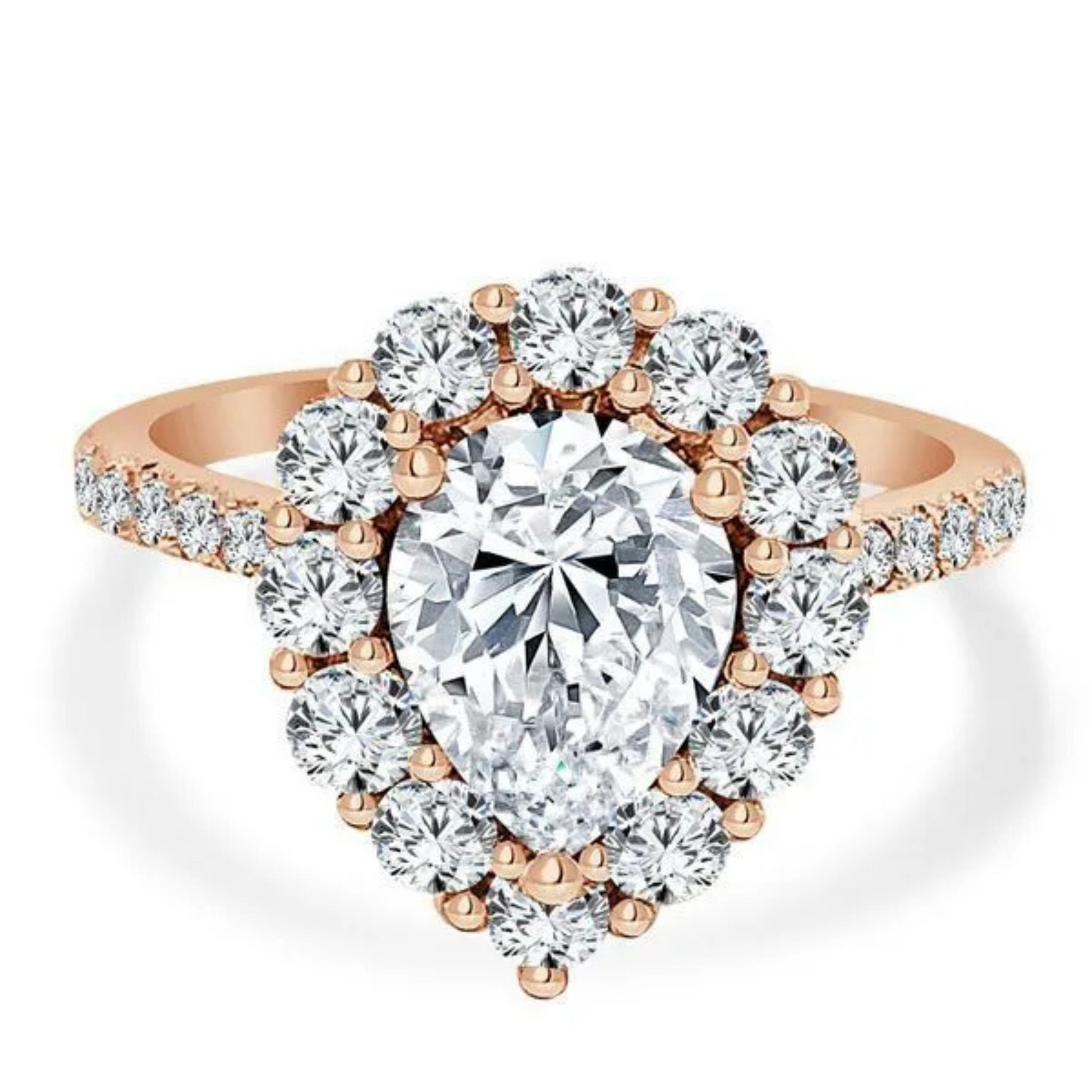 This stunning 14K yellow gold pear-shaped halo semi-mount features 28 round pavé diamonds totaling 1 carat, beautifully surrounding the center diamond in a pear silhouette. The halo amplifies the stone’s brilliance and adds dimension, making it perfect for brides who love a classic yet eye-catching design. Imagine Bridal crafts this piece with responsibly sourced natural diamonds, offering a sustainable choice without compromising elegance. Its timeless style and ethical foundation make it a meaningful symbol of love and commitment. Disclaimer: The center diamond is not included and is sold separately.