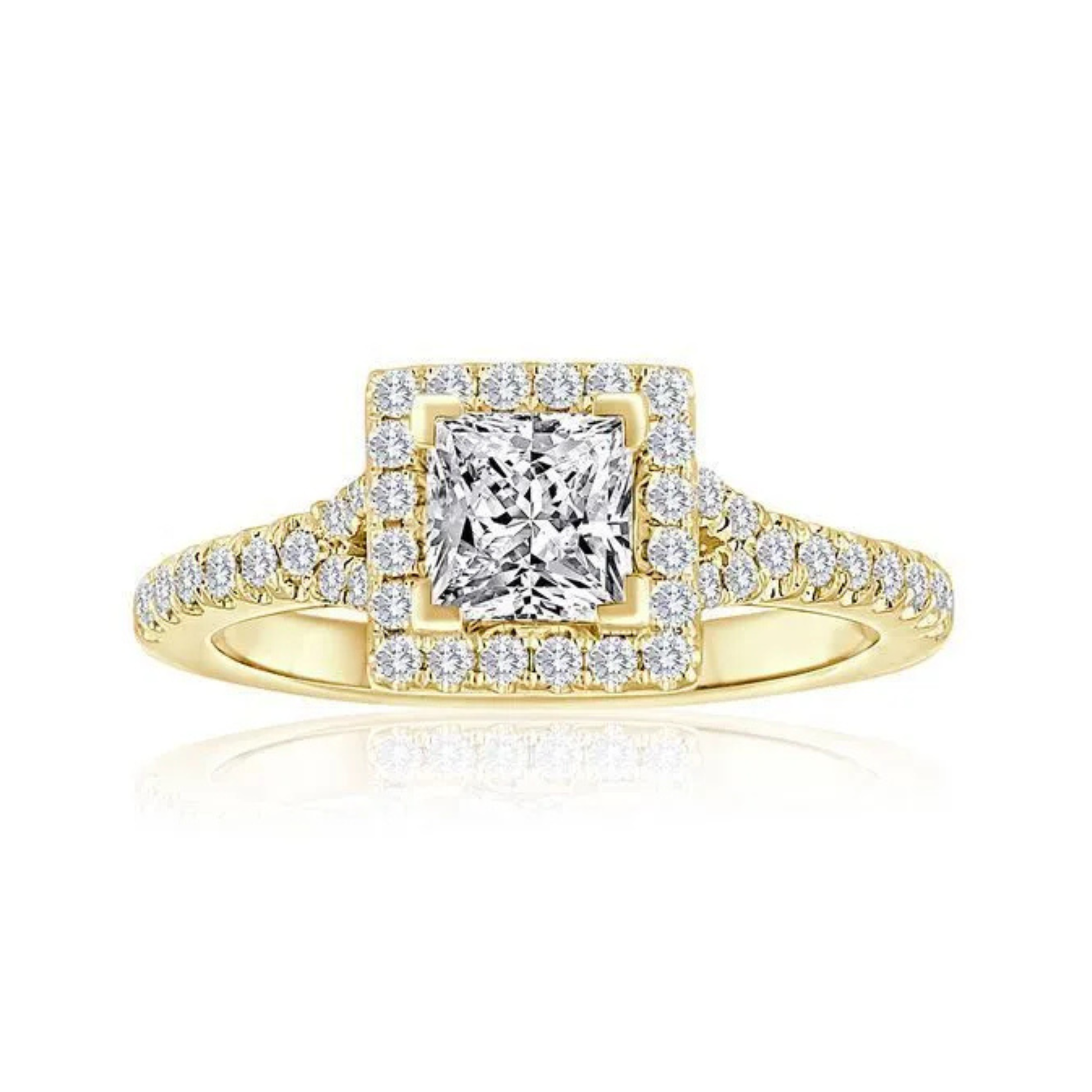 Imagine Bridal’s 14K yellow gold princess semi-mount setting features 42 pavé diamonds totaling 2/5 carat encircling the center diamond in a striking semi-mount design. The princess semi-mount adds geometric brilliance and enhances the ring’s overall sparkle. Crafted with natural diamonds, this ring combines modern style with sustainable values. Perfect for brides who desire a sophisticated and dazzling engagement ring that balances timeless elegance and conscious sourcing. Disclaimer: The center diamond is not included and is sold separately.