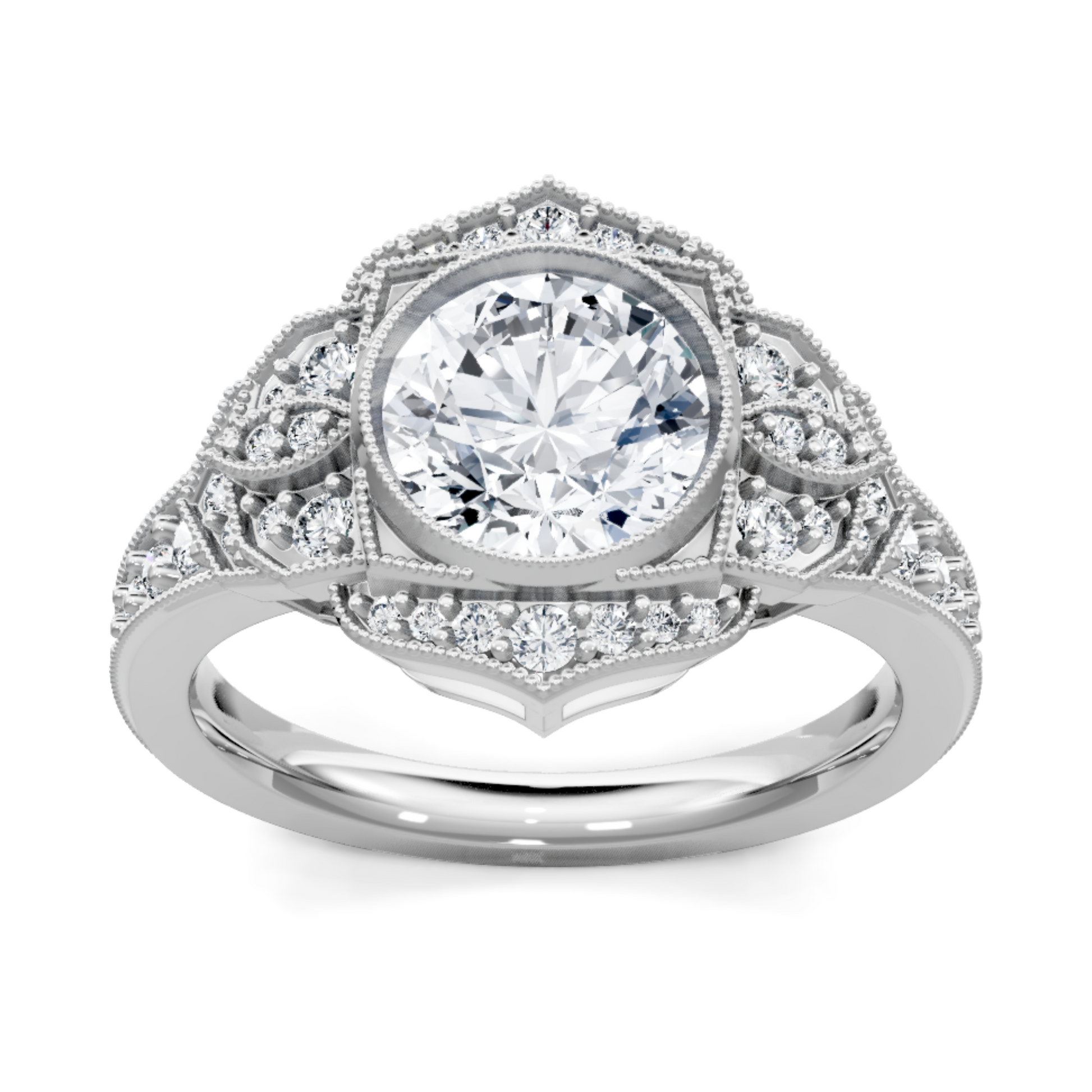 This Imagine Bridal 14K white gold engagement ring features a 2/5 Ct round center diamond surrounded by a delicate floral bezel semi-mount setting with 44 pavé diamonds. The unique floral design adds a romantic, vintage-inspired charm while enhancing the center stone’s brilliance from every angle. Crafted with diamonds, it combines timeless elegance with modern sustainability. Perfect for brides who appreciate feminine detail and nature-inspired beauty, this ring is a graceful symbol of love and commitment designed to last a lifetime. Disclaimer: The center diamond is not included and is sold separately.