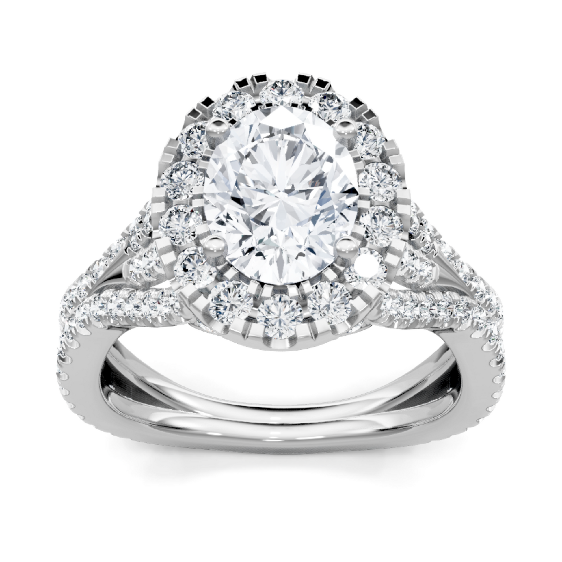 This unique 14K white gold twisting split oval semi-mount ring features 16 round pavé diamonds totaling 1/10 carat along the band and 72 round pavé diamonds totaling 1/2 carat around the oval center stone. The twisting split shank adds movement and modern flair, while the semi-mount enhances brilliance. Crafted with diamonds, this design balances contemporary artistry with ethical luxury. Imagine Bridal delivers a stunning ring for brides seeking a distinctive, dynamic setting that sparkles with responsible craftsmanship. Disclaimer: The center diamond is not included and is sold separately.