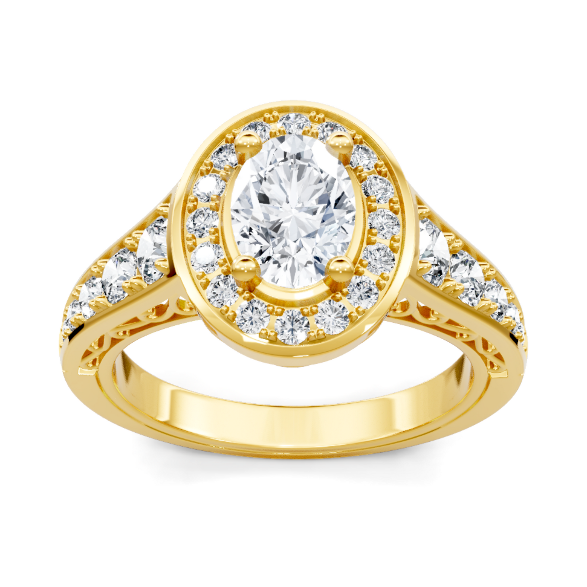 This elegant 14K yellow gold oval graduated semi-mount engagement ring showcases 30 round pavé diamonds totaling 3/4 carat, enhancing the center diamond with a graduated semi-mount design. The varying diamond sizes create a graceful and sparkling frame that amplifies brilliance while maintaining a delicate balance. Crafted with diamonds, this ring reflects Imagine Bridal’s commitment to luxury and fine craftsmanship. Ideal for brides who appreciate timeless elegance paired with a modern touch. Disclaimer: The center diamond is not included and is sold separately.