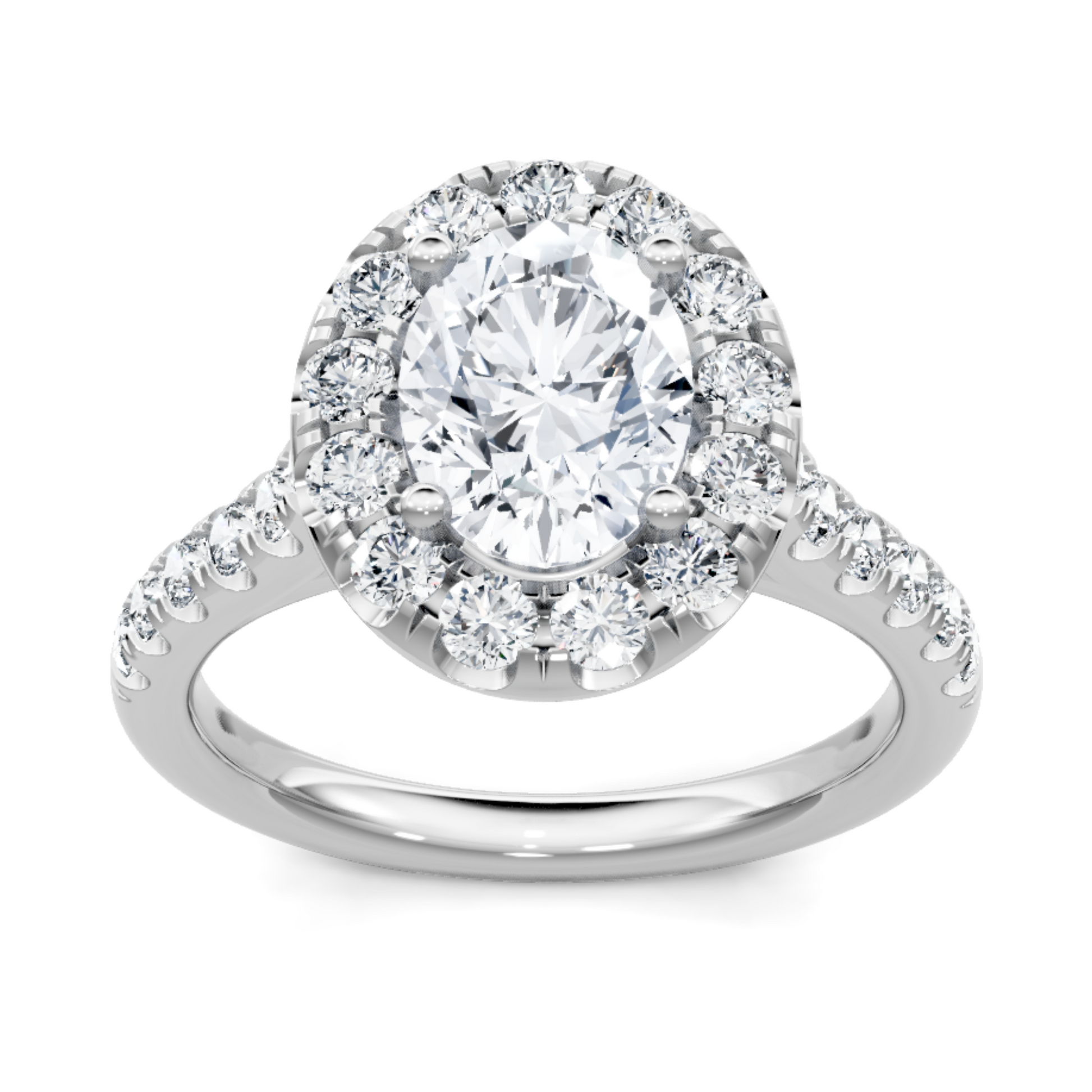 This elegant 14K white gold engagement ring features a 3/4 Ct round center diamond set in an oval-shaped single shank semi-mount setting with 25 round pavé diamonds. The halo adds extra sparkle while the single shank design maintains a sleek silhouette. Perfect for brides who appreciate classic shapes with a modern touch, this ring blends timeless beauty with ethical craftsmanship. Imagine Bridal’s expert design ensures every detail shines with sustainable luxury and refined style. Disclaimer: The center diamond is not included and is sold separately.