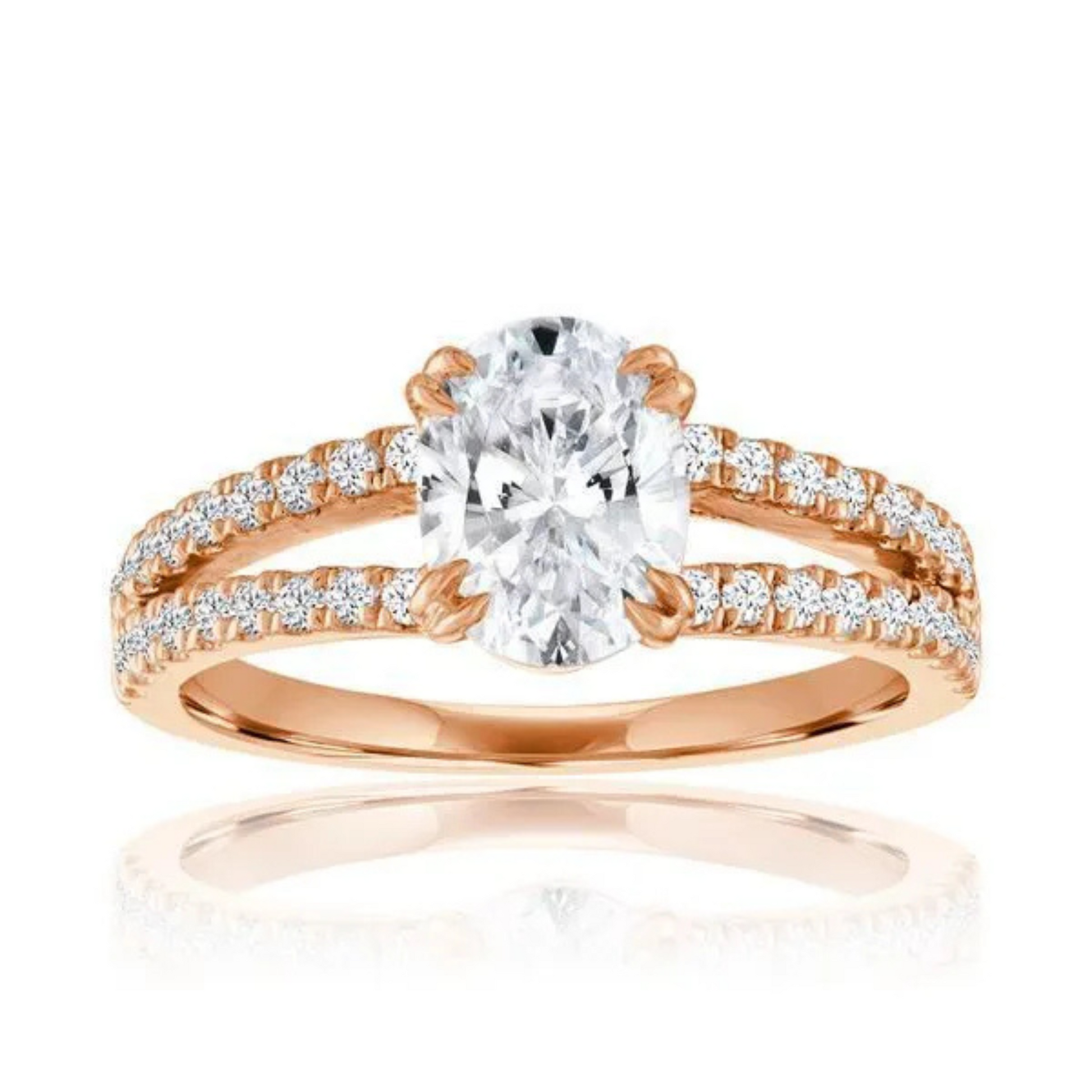 The 14K rose gold oval split shank semi-mount engagement ring from Imagine Bridal features 36 round pavé diamonds totaling 3/8 carat, accentuating the center diamond with radiant brilliance. The split shank design adds an airy, elegant touch, enhancing the overall sparkle and sophistication. Crafted with diamonds, this ring embodies timeless beauty and luxury. Ideal for brides who seek a classic yet contemporary engagement ring that balances delicate details with bold style. Disclaimer: The center diamond is not included and is sold separately.