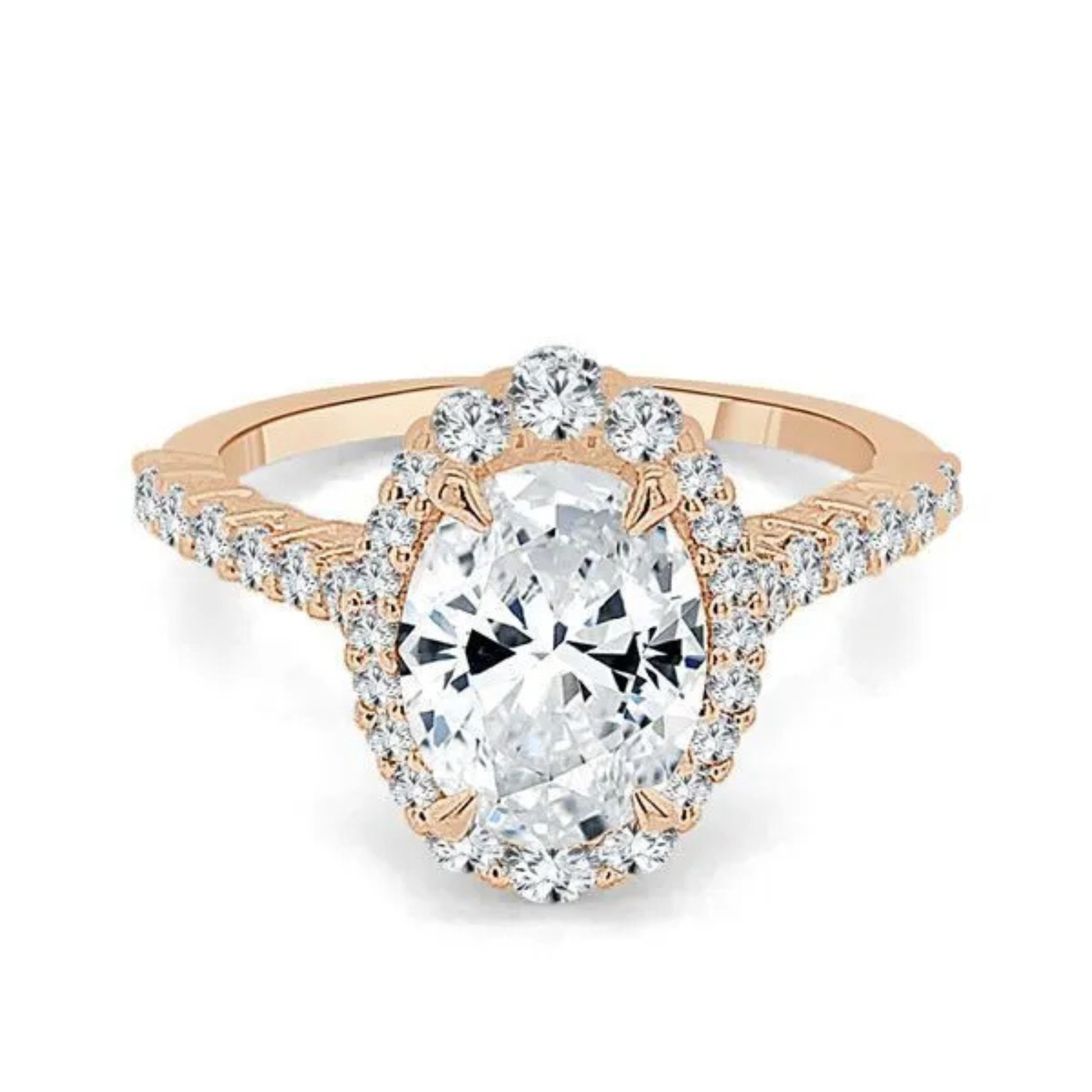 This 14K rose gold oval halo semi-mount features 32 round pavé diamonds totaling 5/8 carat encircling the center stone, offering a brilliant frame that enhances the oval diamond’s shape. The semi-mount allows customization while maintaining exceptional sparkle and craftsmanship. Imagine Bridal combines classic semi-mount design with modern sustainability, perfect for brides who want a luxurious and ethically made setting to showcase their unique center diamond. Disclaimer: The center diamond is not included and is sold separately.
