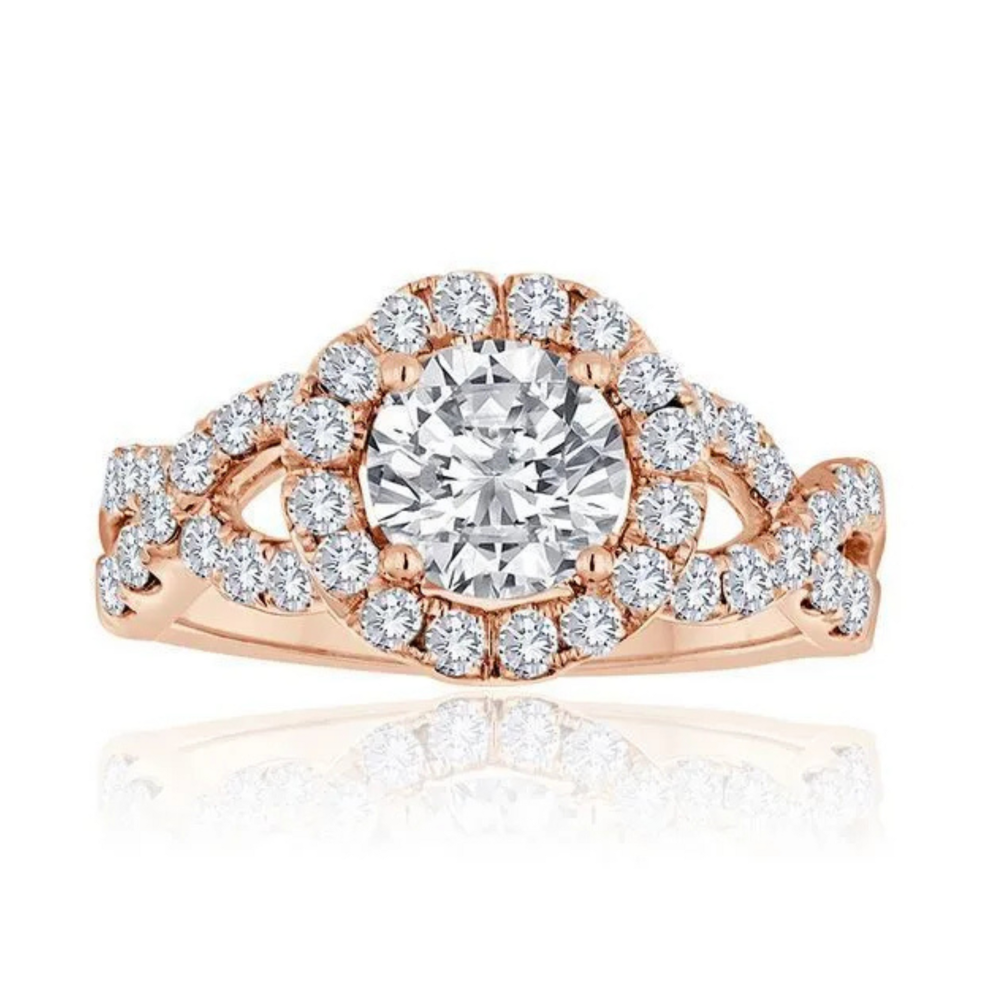 Imagine Bridal’s 14K rose gold round diamond pave twist semi-mount setting dazzles with 38 round pavé diamonds totaling 5/8 carat, swirling beautifully around the center natural diamond. The twisting semi-mount design enhances the center stone’s brilliance and adds a unique, contemporary flair. Made with ethically sourced natural diamonds, this ring balances exquisite sparkle with responsible luxury. Perfect for brides seeking a standout semi-mount engagement ring that combines modern artistry and timeless elegance. Disclaimer: The center diamond is not included and is sold separately.