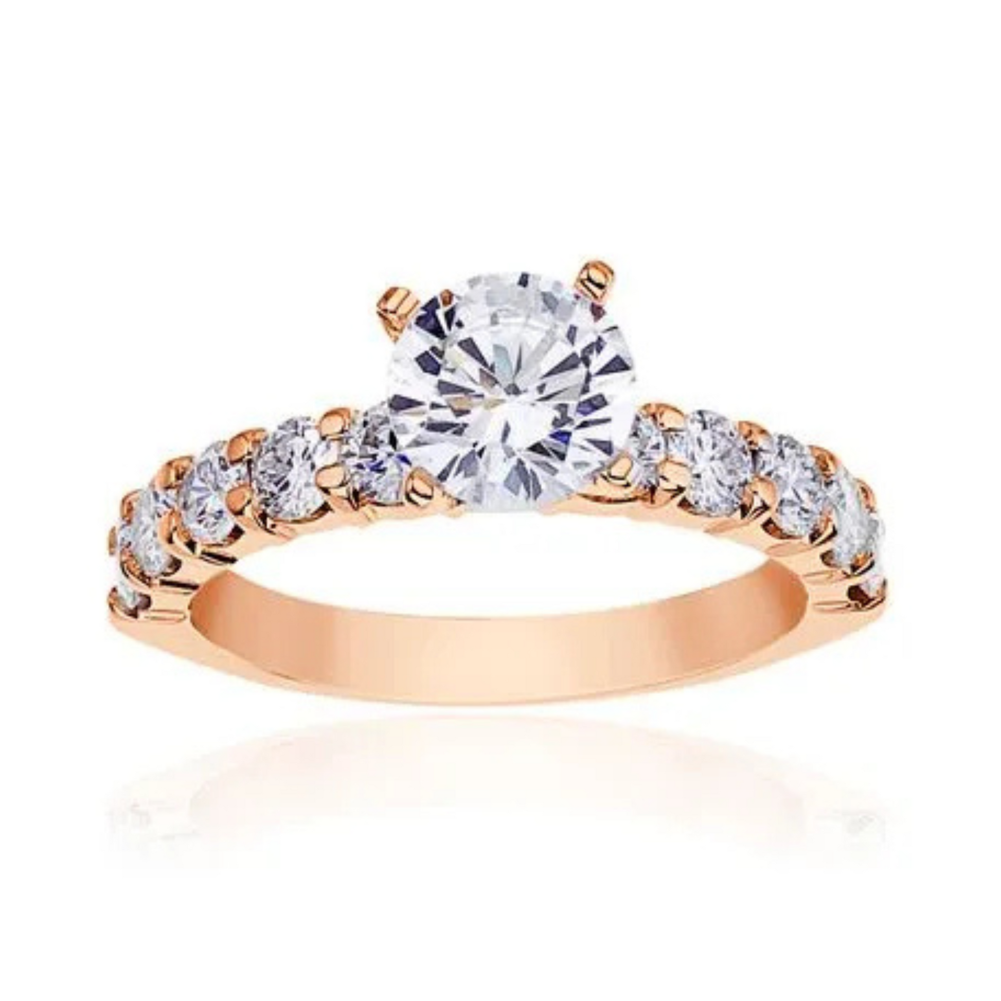 This sophisticated 14K rose gold shared prong semi-mount setting features 10 round pavé diamonds totaling .90 carat, delicately spaced to maximize light exposure and brilliance around the center natural diamond. The shared prong design offers a classic, open look while ensuring secure diamond placement. Crafted with natural diamonds, this setting reflects Imagine Bridal’s commitment to sustainability and quality. It’s ideal for brides seeking an elegant, sparkling foundation for their engagement ring with timeless appeal. Disclaimer: The center diamond is not included and is sold separately.