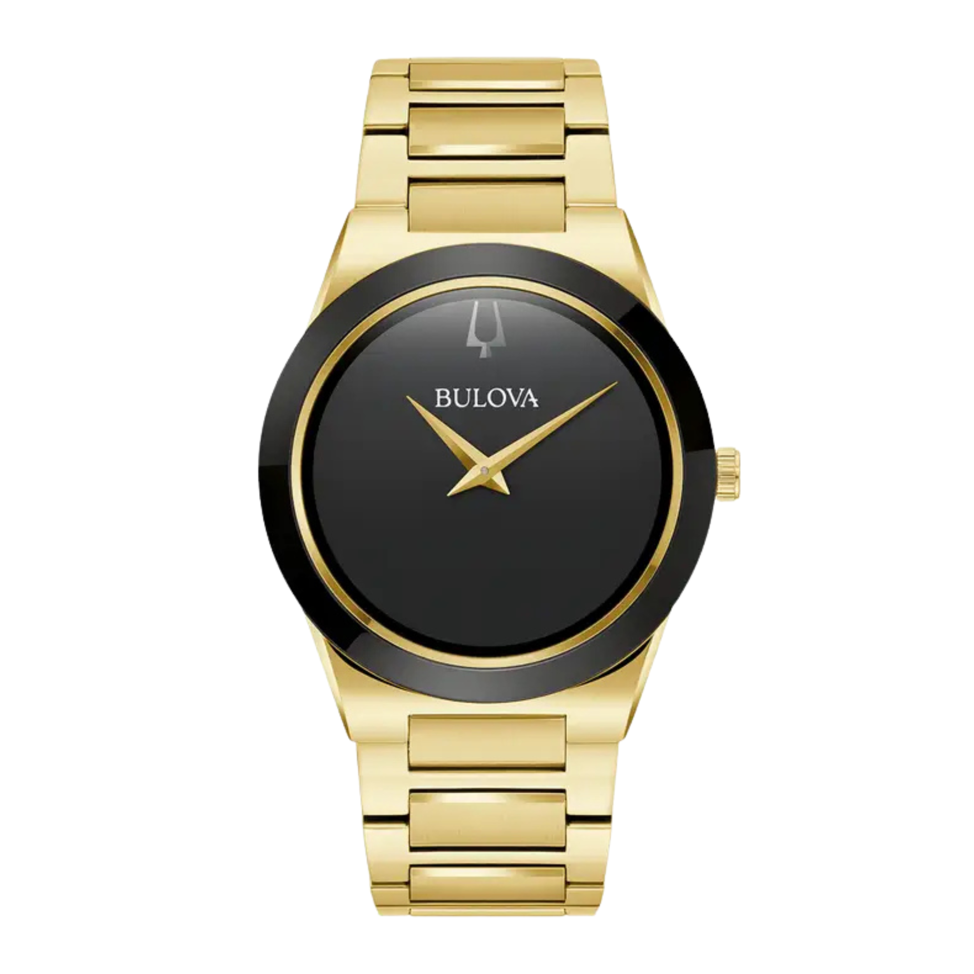 Black bezel (formed by the metalized edge-to-edge crystal) with a gold-tone case ring |