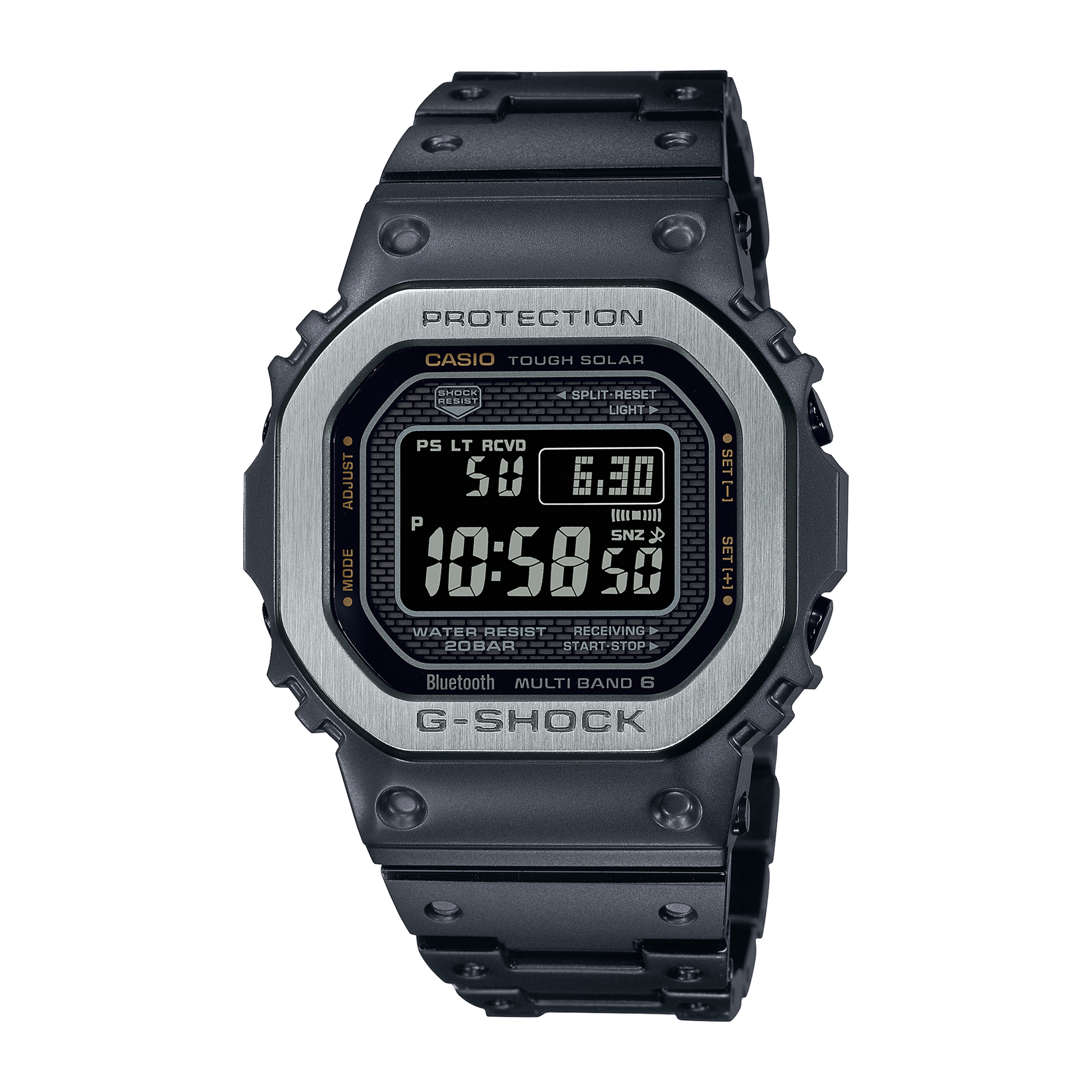 The G-SHOCK GMWB5000MB-1 from the Full Metal 5000 collection is built for men who want toughness with refined style. It features a 49.3 × 43.2 × 13.0 mm case crafted from Stainless steel (black ion plated), matched to a Stainless steel and Stainless steel band. The dial/display is Reverse LCD (black), delivering crisp legibility in all conditions. Timekeeping is handled by a Tough Solar, Multiband 6, Bluetooth system for dependable accuracy and everyday convenience. Water resistance is rated to 200 m, so it’s ready for swimming and harsh weather. Key features: Screw-back; World time; 1/100-sec stopwatch; Countdown timer; 5 alarms; Super Illuminator. As with every G‑SHOCK, you also get the signature shock‑resistant construction and rugged reliability for years of worry‑free wear. G‑SHOCK engineering blends resilient materials with thoughtful ergonomics, from the protective bezel architecture to the comfortable strap. Sapphire or mineral crystals, high‑brightness illumination and intuitive controls make these watches easy to live with day to day. Whether you’re training, traveling or tackling the workweek, this model balances performance, practicality and distinctive design so it feels as capable as it looks.