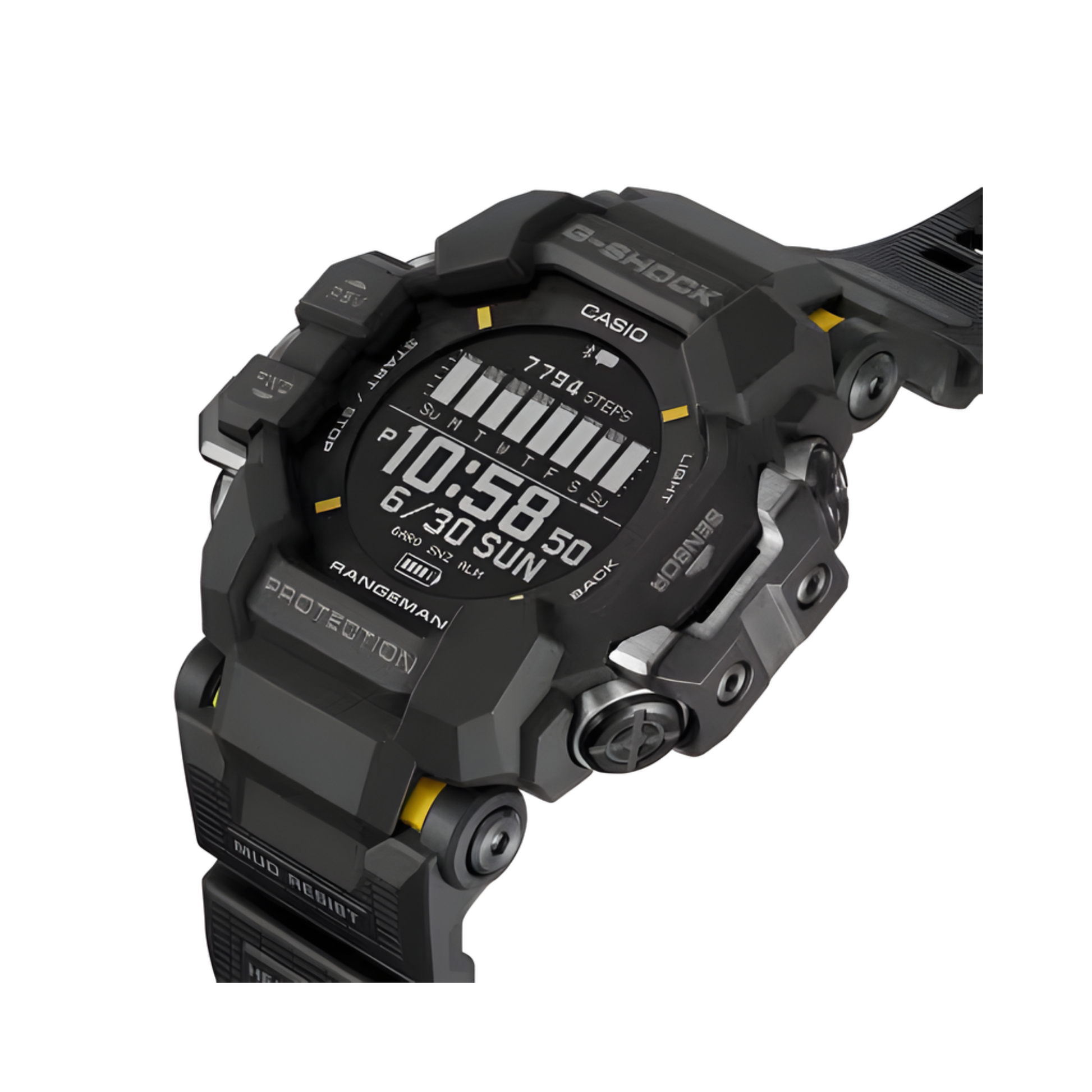 The G-SHOCK GPRH1000-1 RANGEMAN is engineered for extremes, featuring GPS functionality, an optical heart rate sensor, and solar-assisted charging for endurance in the field. Its 60.6 mm tough resin case, black dial, and resin band ensure durability and comfort in harsh conditions. Equipped with Triple Sensor technology (altimeter/barometer, compass, thermometer), Bluetooth connectivity, and 200-metre water resistance, it’s built for serious outdoor missions.