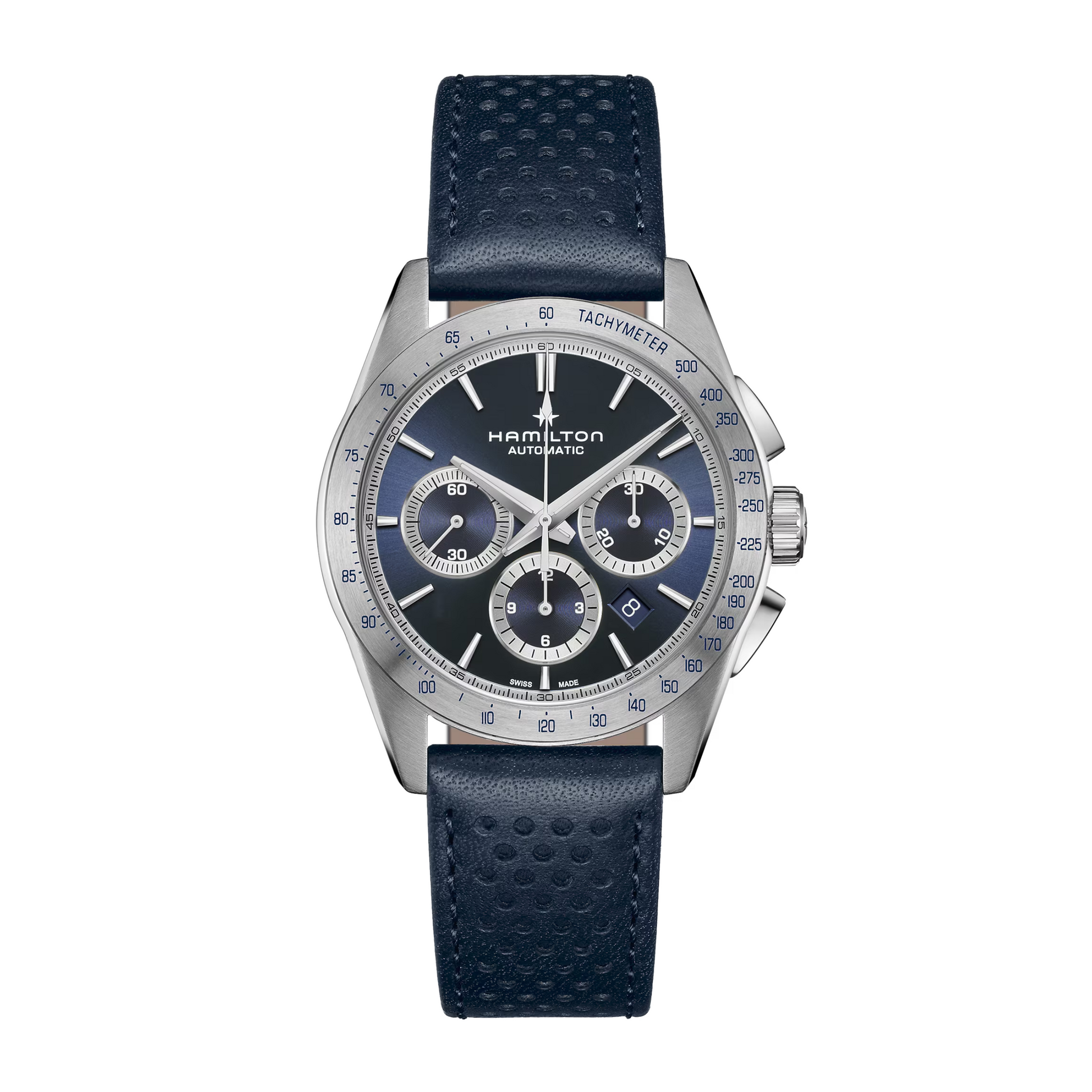 The Hamilton Jazzmaster Performer Auto Chrono 42 mm is crafted for those who live life with energy and precision. Its bold blue dial, framed by a dynamic chronograph layout, radiates sport-chic confidence while staying true to Hamilton’s refined design language. The automatic movement ensures reliable performance, making it not just a watch, but a companion built for both action and style. Paired with a matching blue perforated leather strap, the timepiece offers a seamless balance of comfort and character. With its contemporary detailing and sporty elegance, the Jazzmaster Performer Auto Chrono is perfect for anyone who appreciates a watch that moves effortlessly from everyday wear to standout moments. Identified by SKU no H36616640.