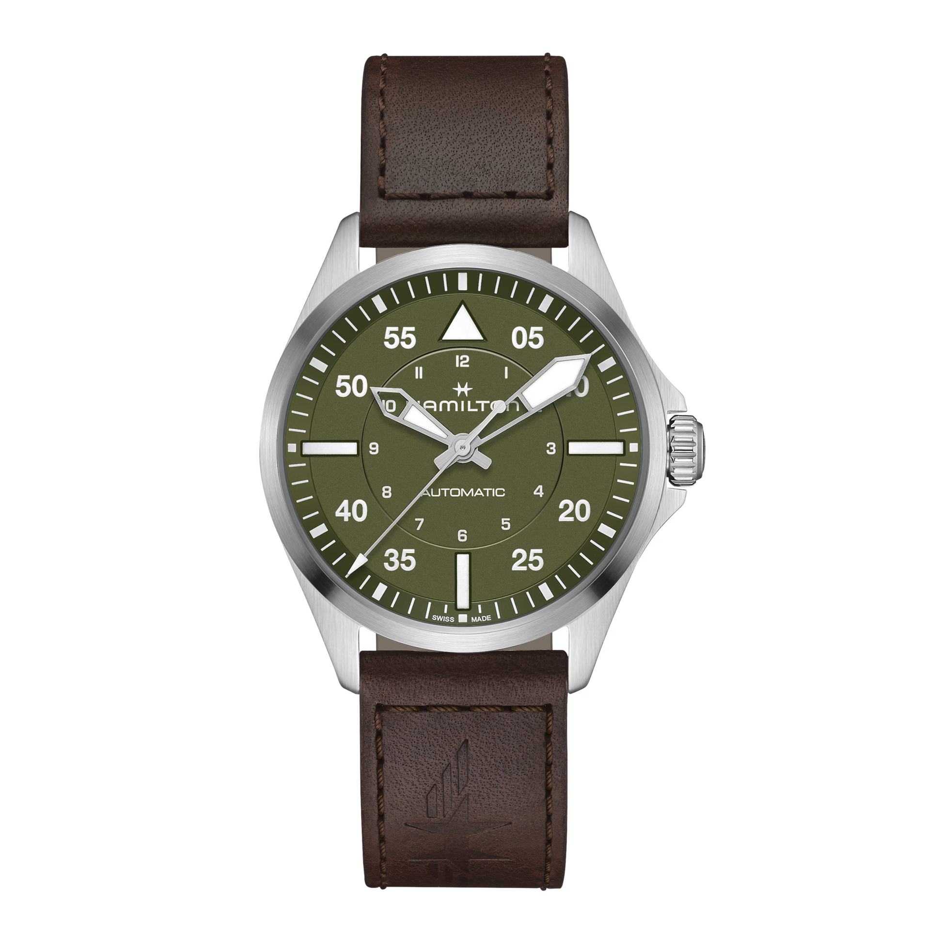 The Hamilton Khaki Aviation Pilot Auto 39 mm Green Stainless Steel Automatic Watch takes inspiration from classic Type-B aviator designs, built for precision and legibility in the skies. Its rich green dial is laid out with an inner 12-hour scale and a bold outer 60-minute track, paired with luminous hands and markers for optimal visibility in low light. The 39 mm stainless steel case strikes the perfect balance between vintage proportions and modern wearability, while the sapphire crystal ensures lasting clarity and durability. Powered by Hamilton’s Swiss automatic movement, this watch delivers reliability and performance with every flight or everyday adventure. The stainless steel bracelet adds a refined touch to its utilitarian military roots, making it a versatile piece that bridges functionality and style. A true pilot’s companion, ready for ground or air. Identified by SKU no. H76305560
