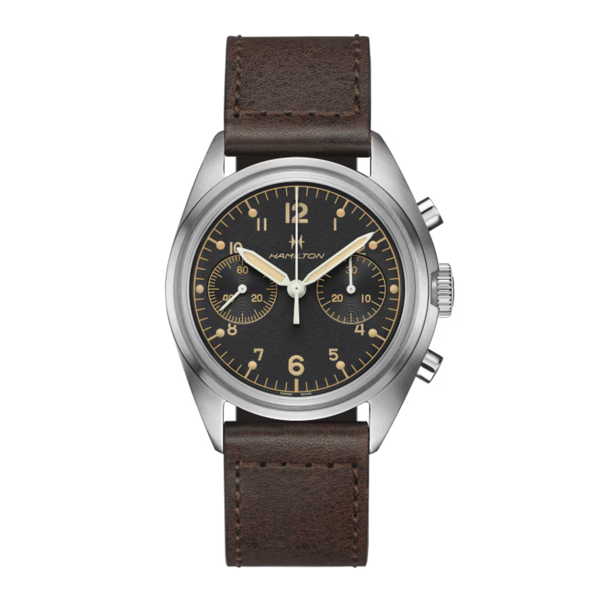 The Hamilton Khaki Aviation Pilot Pioneer Mechanical Chrono 40mm with a black dial is a tribute to classic RAF-inspired aviation timepieces. Its bold black dial, paired with clear chronograph sub-dials and luminous hands, ensures precise readability even in challenging conditions. Powered by a manual-wind movement, this watch connects you to the traditional art of Swiss watchmaking, offering a tactile, hands-on experience with every winding. Encased in stainless steel, the Pilot Pioneer Mechanical Chrono blends vintage charm with modern reliability. Its RAF-inspired design celebrates Hamilton’s aviation heritage, making it perfect for enthusiasts who appreciate precision, history, and timeless style. This watch is a statement of adventure, craftsmanship, and enduring elegance on the wrist. Identified by SKU no. H76409530.