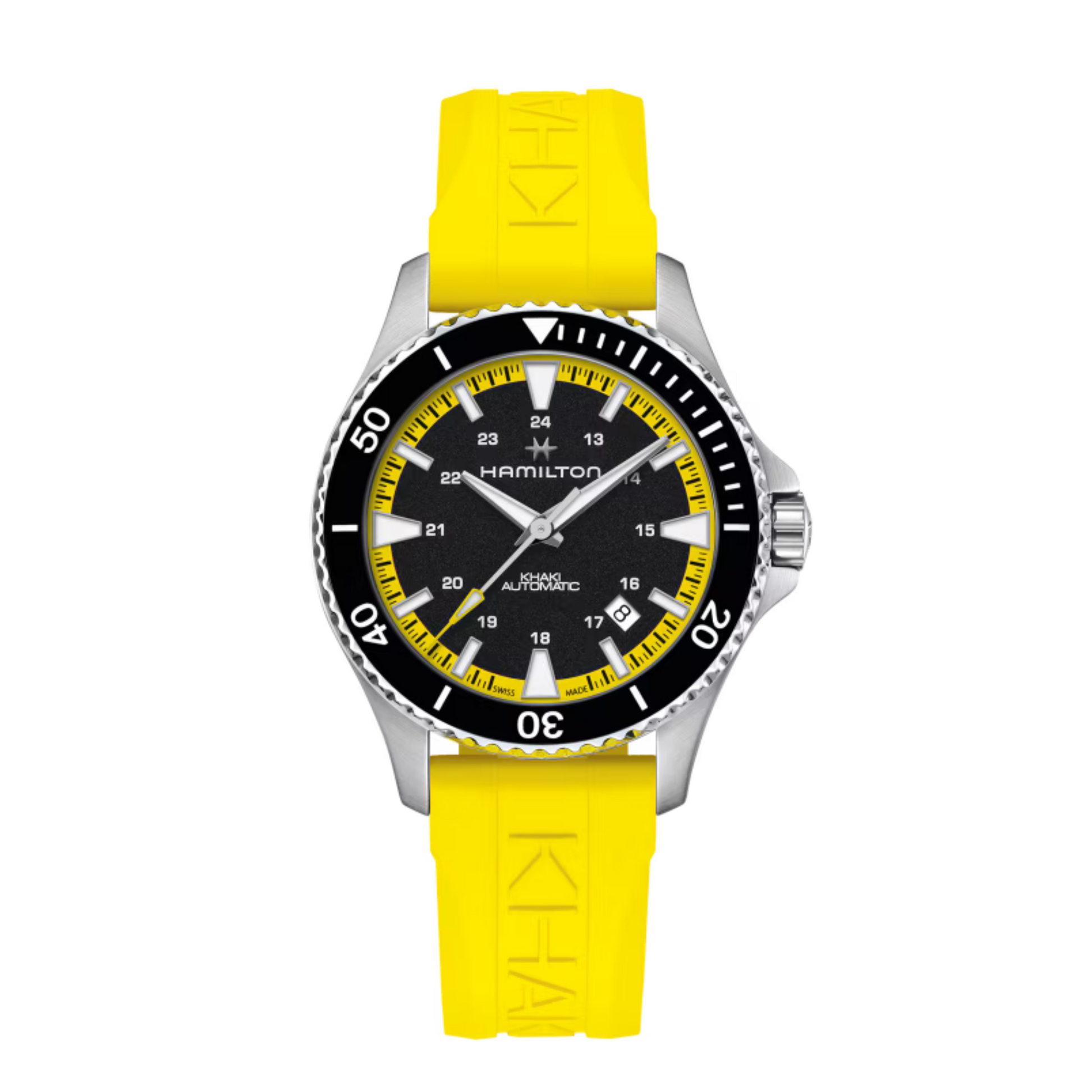 The Hamilton Khaki Navy Scuba Auto 40 mm in black with bold acid-yellow accents is built to command attention both underwater and on land. Its striking color combination brings a fearless energy to the classic dive silhouette, while the stainless steel case ensures durability and everyday versatility. The 40 mm size makes it approachable for daily wear, yet bold enough to stand out as a statement piece. Equipped with a Swiss automatic movement and crafted for water resistance up to 100 meters, this watch doesn’t just look adventurous—it’s designed for it. The luminous acid-yellow details against the black dial and bezel enhance readability in any condition, giving it a functional edge with undeniable flair. This Khaki Navy Scuba is not just a dive companion—it’s an expression of confidence, energy, and daring style. Identified by SKU no H82395332.