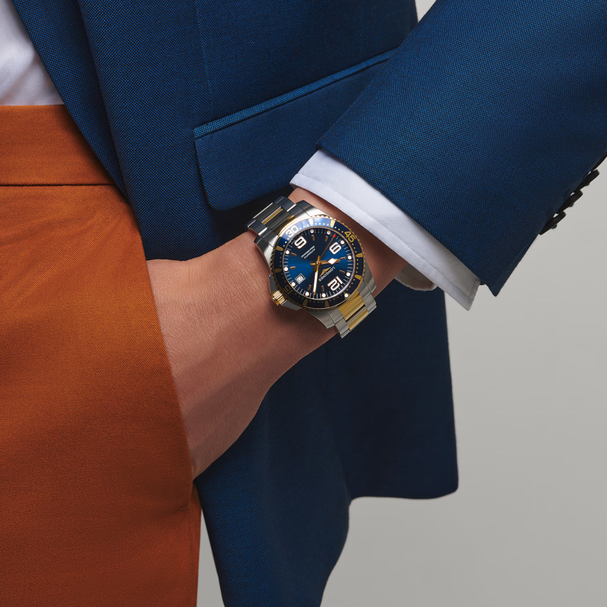 Originally launched in 2007, the HydroConquest collection perfectly embodies Longines’ legacy of combining elegance and endurance. As part of the brand’s contemporary sport line, this timepiece captures the spirit of classic diving watches with sophisticated aesthetics and advanced functionality. Movement: L888 Calibre automatic movement. Power Reserve: Up to 72 hours. Case: 41mm stainless steel and yellow PVD coating. Bracelet: Stainless steel and yellow PVD with double safety folding clasp. Water Resistance: 30 bar (300 metres / 1000 feet). Dial: Sunray blue with applied numerals and gilt hands. Bezel: Unidirectional rotating bezel. Additional Features: Super-LumiNova® coated hands and indexes for superior legibility underwater, date display at 3 o’clock. Identified by SKU no. L37423967