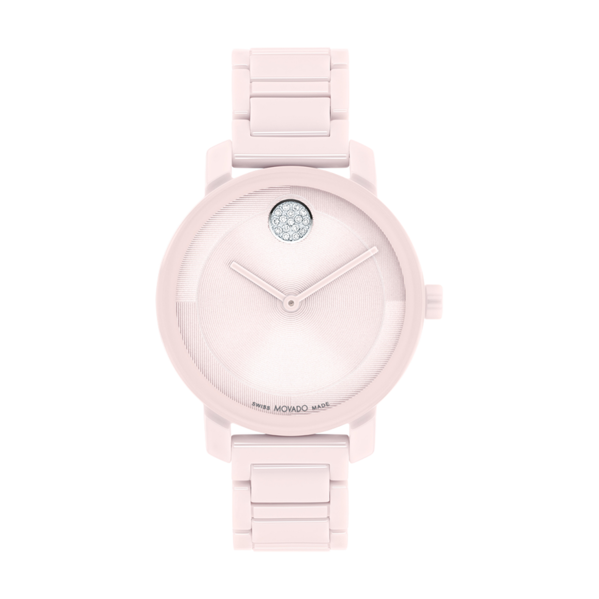 The Movado BOLD Evolution 2.0 captures the essence of modern sophistication with a striking design that feels both refined and contemporary. Crafted in sleek blush pink ceramic, this women’s timepiece features a 34mm case that showcases the brand’s legendary Museum dial, reimagined with a micro-textured finish. At 12 o’clock, a sparkling preciosa crystal dot adds a touch of glamour, while slim hands glide effortlessly across the surface for a clean, minimalist look. A durable K1 crystal fabrication protects the dial, and the watch is powered by a precise Swiss quartz movement for dependable accuracy. Completing the design is a flexible blush ceramic H-link bracelet that seamlessly complements the case for a unified aesthetic. Water-resistant up to 3 ATM, this elegant watch balances everyday wearability with statement-making style. Perfect for the modern woman, the BOLD Evolution 2.0 embodies Movado’s legacy of artistry and innovation in horology. SKU 3601234
