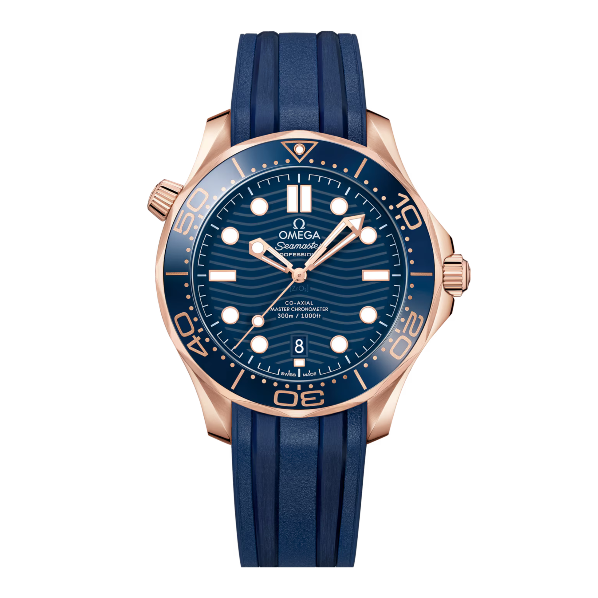 The Omega Seamaster Diver 300M 42mm Blue Ceramic Wave watch in 18K Sedna™ gold is the ultimate luxury dive timepiece. Its full rose gold case and bracelet perfectly complement the blue ceramic wave-patterned dial, creating a striking and elegant design. Powered by Omega’s automatic Master Chronometer movement, it delivers exceptional accuracy, reliability, and durability for both underwater adventures and refined everyday wear. With a unidirectional rotating bezel, helium escape valve, and 300-meter water resistance, this Seamaster Diver 300M is built for professional diving. Combining opulent materials, iconic design, and advanced horology, the full rose gold edition offers a perfect balance of luxury, performance, and Omega’s rich legacy in diving excellence. Identified by SKU: 210.62.42.20.03.001.