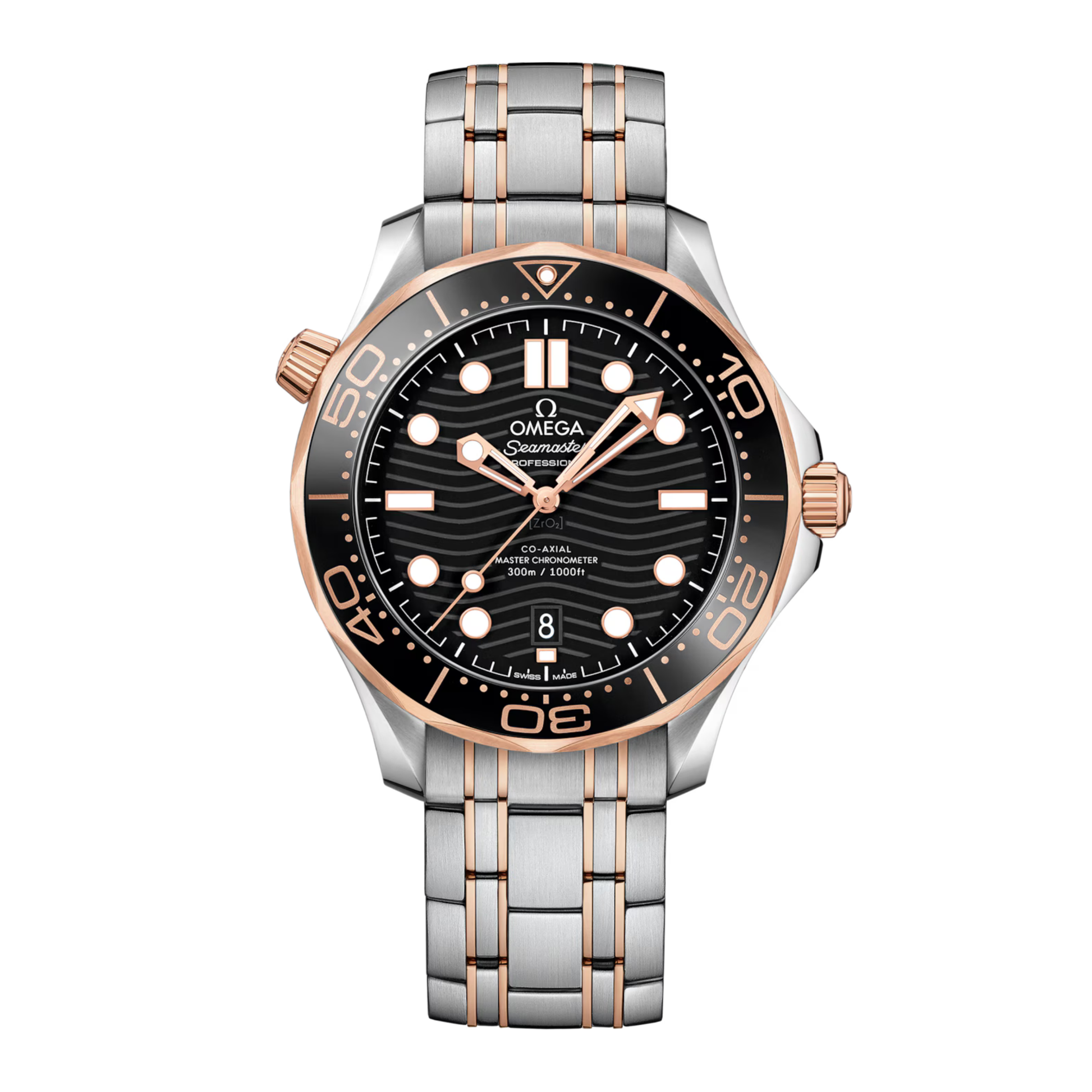The Omega Seamaster Diver 300M 42mm Black Ceramic Dial watch in stainless steel and 18K Sedna™ gold is a striking two-tone dive icon. Its black ceramic wave-patterned dial is complemented by a polished steel and rose gold case, combining elegance with professional-grade functionality. Powered by Omega’s automatic Master Chronometer movement, it delivers exceptional precision, reliability, and durability for both underwater adventures and daily wear. Equipped with a unidirectional rotating bezel, helium escape valve, and 300-meter water resistance, this Seamaster Diver 300M is built for serious diving. The fusion of luxurious materials, iconic design, and advanced horology makes this edition a standout timepiece for collectors and enthusiasts seeking style, performance, and Omega’s rich diving heritage. Identified by SKU: 210.20.42.20.01.001.