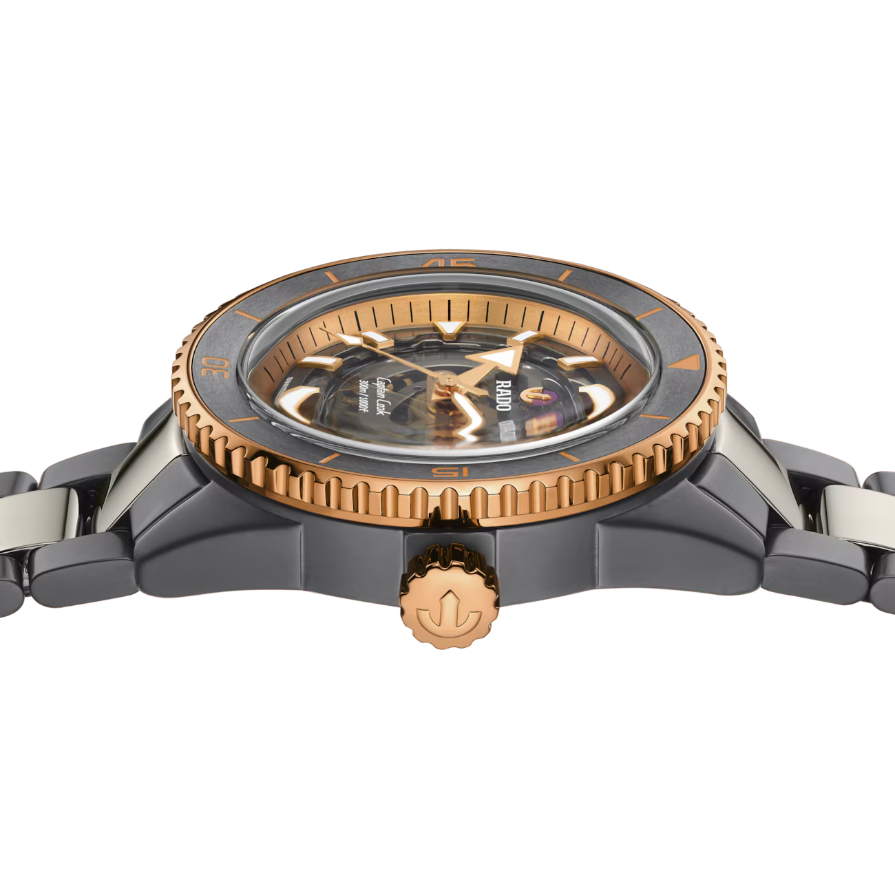 The Captain Cook High-Tech Ceramic Skeleton showcases its innovative R808 movement, a marvel of contrasts, know-how and clever geometry, that allows a distinct view of the various parts. It's equipped with an anti-magnetic and highly reliable NivachronTM hairspring that has been fully tested in five positions and provides up to 80 hours of power reserve. The superb matt-finish monobloc case is framed by a circular-brushed plasma high-tech ceramic bezel insert which matches the tones of the case and the outer bracelet links. Inside the rotatable bezel, a warm and bright rose-gold-coloured index ring adds contrast, next to the box-shaped sapphire crystal with anti-reflective coating on both faces. The dial itself is intentionally spartan, with hands treated with white Super-LumiNova to enhance readability in low-light conditions. Identified by SKU: R32148162.