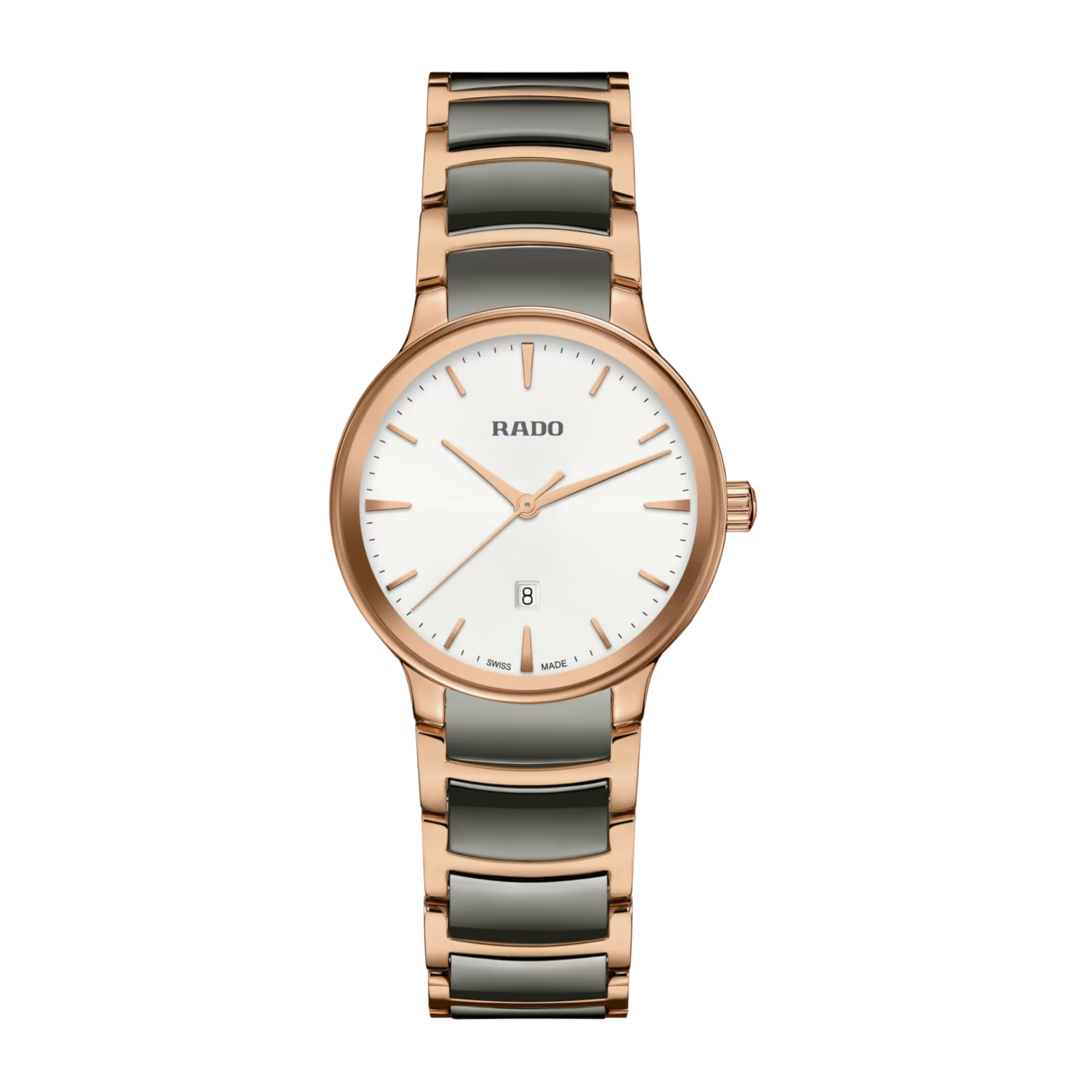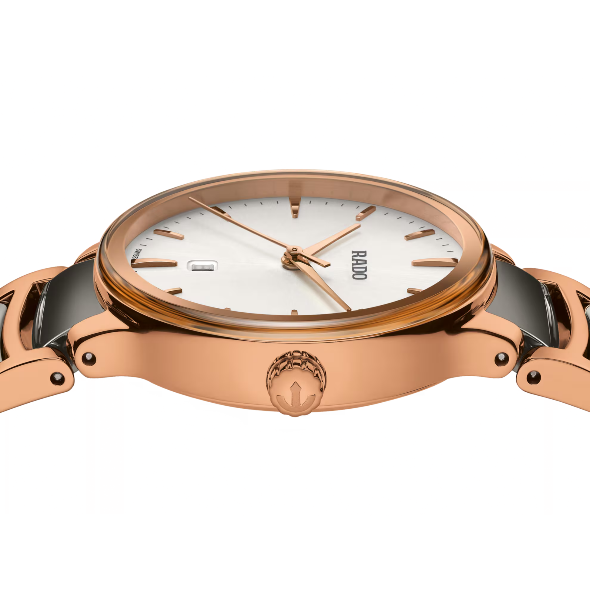 The classic Rado Centrix Automatic R30019012 has been refined both technically and visually. It features a rounded sapphire crystal that extends seamlessly to the curved case, creating a smooth, elegant profile. The design is enhanced by redesigned case lugs and a polished rose-gold-coloured PVD-coated stainless steel bracelet, accented with plasma high-tech ceramic center links for a modern touch.