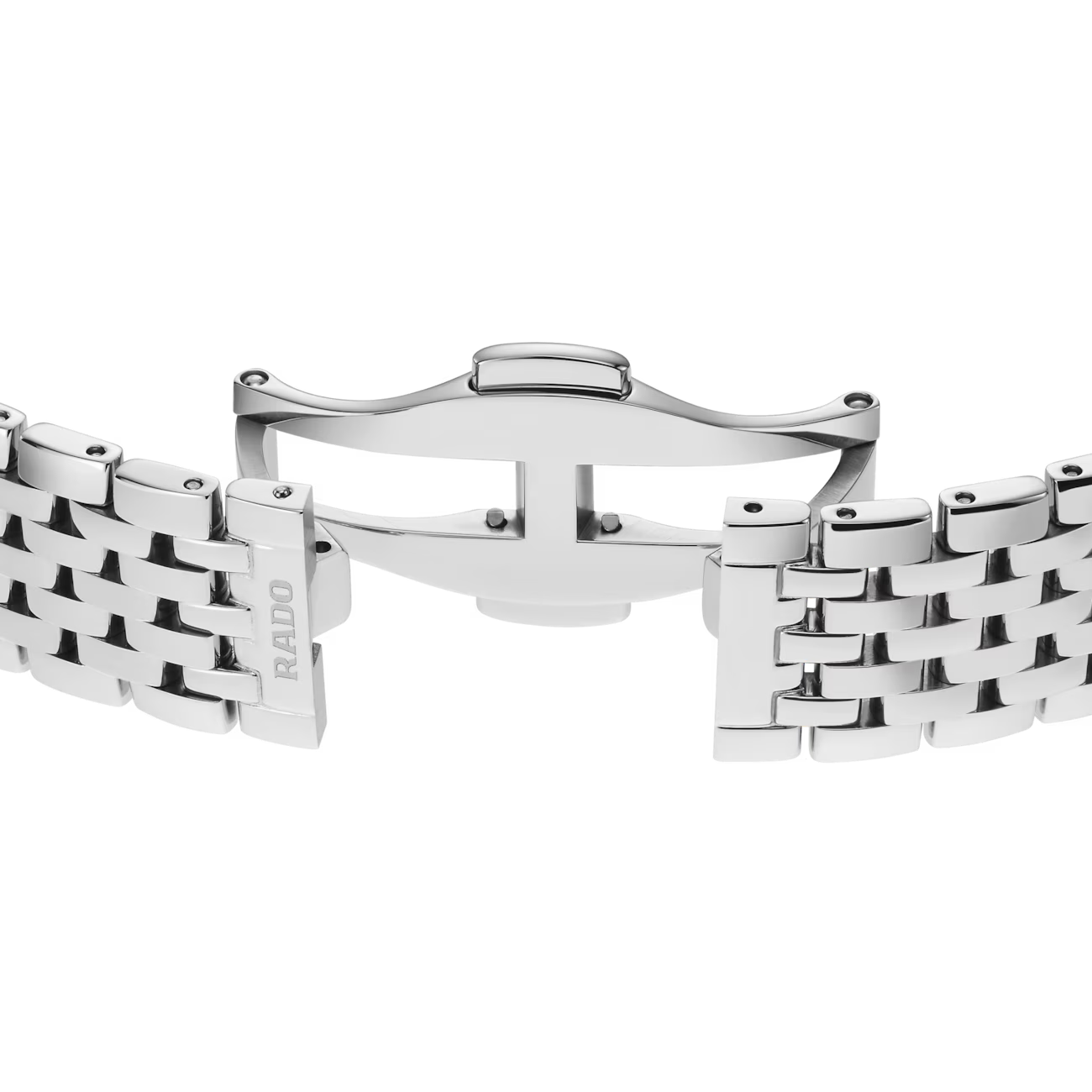 The Rado Florence Diamonds watch embodies timeless elegance, inspired by the architectural beauty of Florence. Featuring a 30mm stainless steel case, a sleek black dial adorned with four full-cut diamonds at 3, 6, 9, and 12 o'clock, and rhodium-plated hands, this Swiss-made timepiece offers precision with its quality quartz movement. The innovative edge-to-edge metalized sapphire crystal enhances durability, making it a refined choice for those who appreciate luxury and sophistication. Identified by SKU: R48913713.
