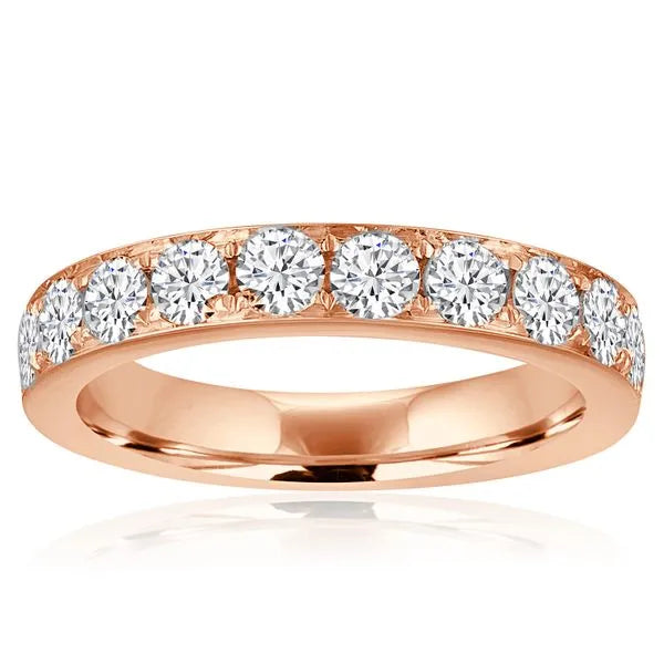 Radiate timeless elegance with this 14KR Rose' Gold bead-set eternity band, featuring 29 round diamonds totaling 1 carat. The meticulous bead setting secures each stone while enhancing its sparkling brilliance. Delicate milgrain accents add vintage-inspired texture, beautifully contrasting with the sleek gold band. Crafted to symbolize everlasting love, this piece pairs classic design with radiant sparkle, making it a stunning symbol of commitment. Its refined silhouette and luminous diamonds promise to capture hearts and shine brightly for a lifetime, offering sophistication that complements any bridal jewelry collection.