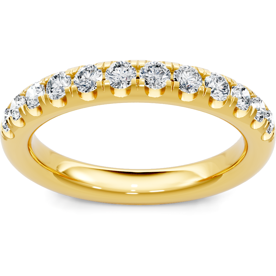 This elegant 14KR Yellow Gold wedding band showcases 12 round diamonds totaling ½ carat, set in a classic pave style that creates a radiant and continuous sparkle around the finger. The pavé setting’s closely set diamonds craft a dazzling “diamond road” effect that dazzles from every angle. Designed with a graceful simplicity, this band symbolizes the unending promise of love and commitment. Perfect for brides seeking a refined, timeless piece, it complements any bridal ensemble with its luminous brilliance and sophisticated craftsmanship, making it a cherished symbol of everlasting devotion.