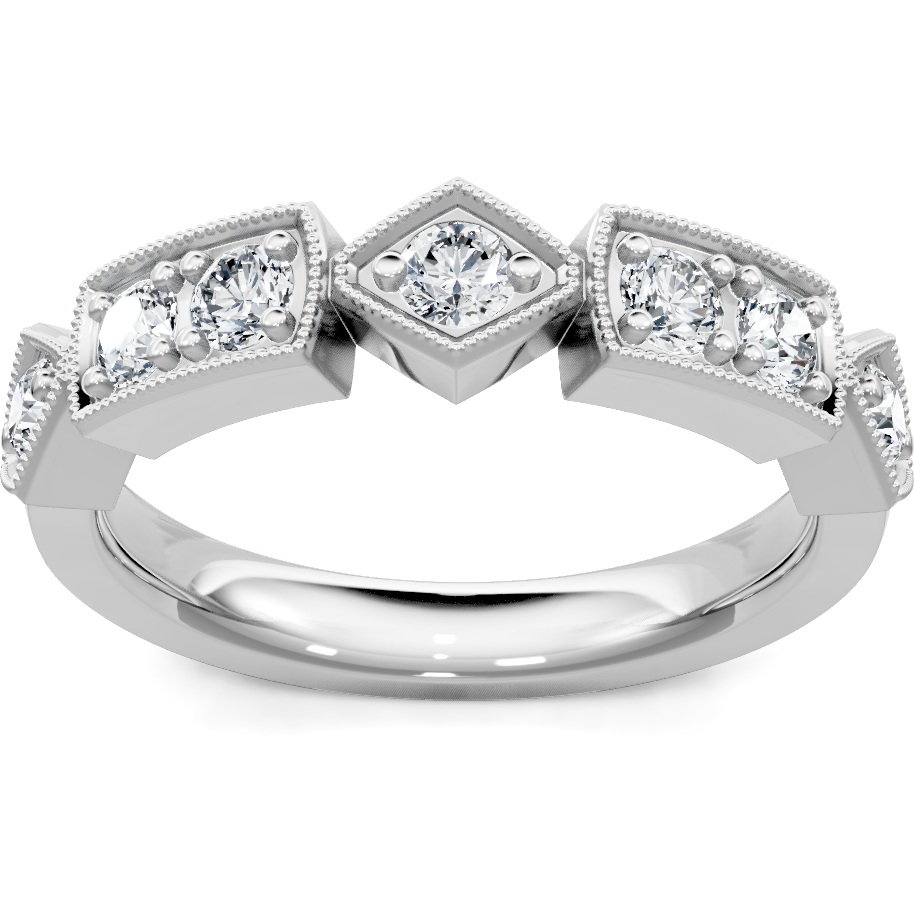 Delight in the vintage charm of this 14KR White Gold bezel set pave milgrain eternity band, adorned with 13 round diamonds totaling 1/10 carat. The combination of the secure bezel setting and delicate milgrain edging creates a beautifully textured frame that enhances each diamond’s sparkle. This band embodies timeless elegance with a refined, romantic touch, making it a treasured symbol of everlasting love. Comfortable for everyday wear and designed with exquisite craftsmanship, it is a graceful addition to any bridal collection, shining as a testament to your lifelong commitment.