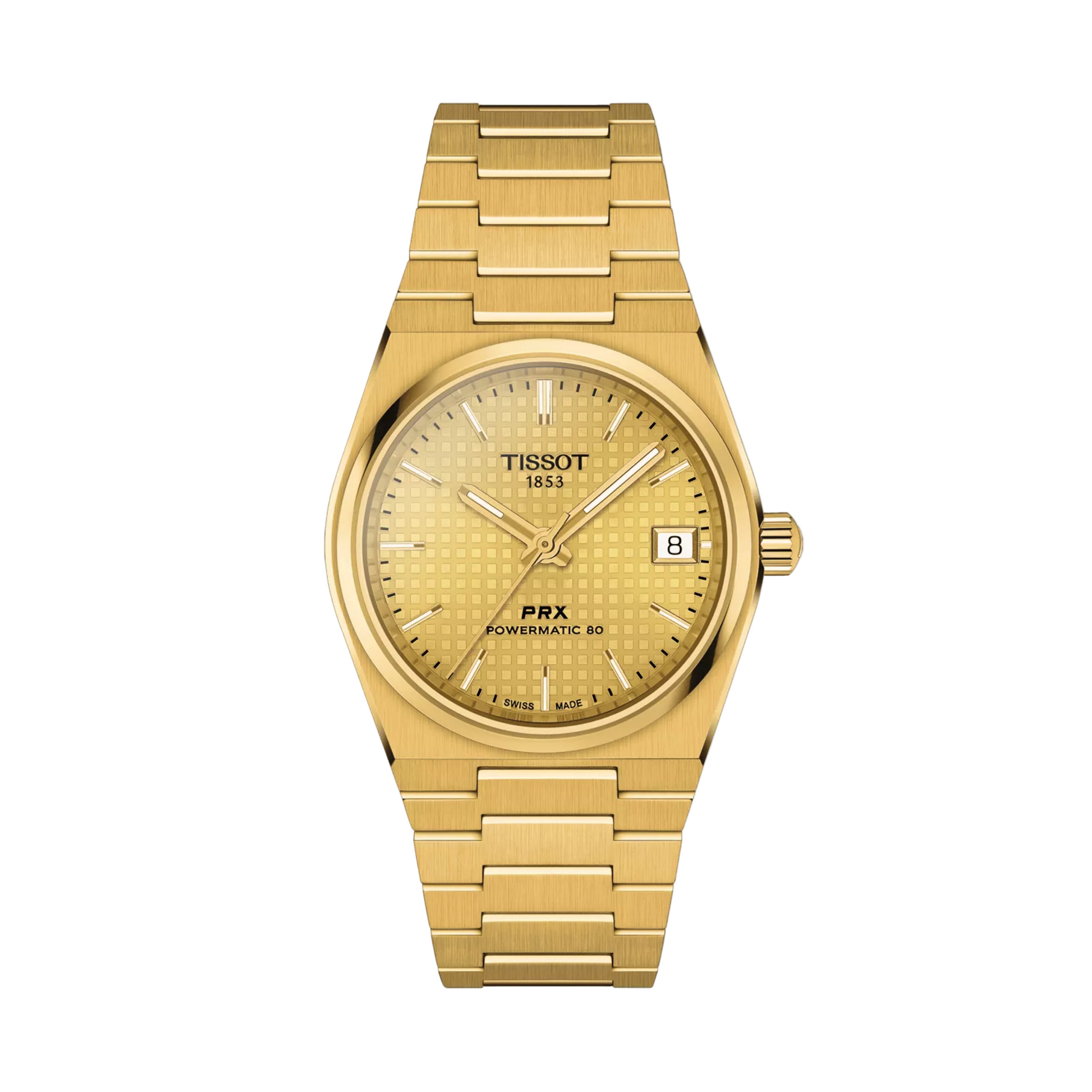 The Tissot 80 Automatic PRX Gold PVD Yellow Bracelet Sapphire Crystal Champagne Dial 35mm is a distinctive men's watch designed for style and precision. It features a 35mm case in Stainless Steel showcasing a Champagne dial set on a stainless steel bracelet. It is powered by a Swiss Automatic movement, with a bezel, and water resistance up to 100m, with Super‑LumiNova for legibility in low light, delivering a power reserve of 80 hours. Identified by SKU TISSOT: T1372073302 100, it offers authenticity and assurance. Thoughtfully finished, it balances everyday practicality with enduring elegance.
