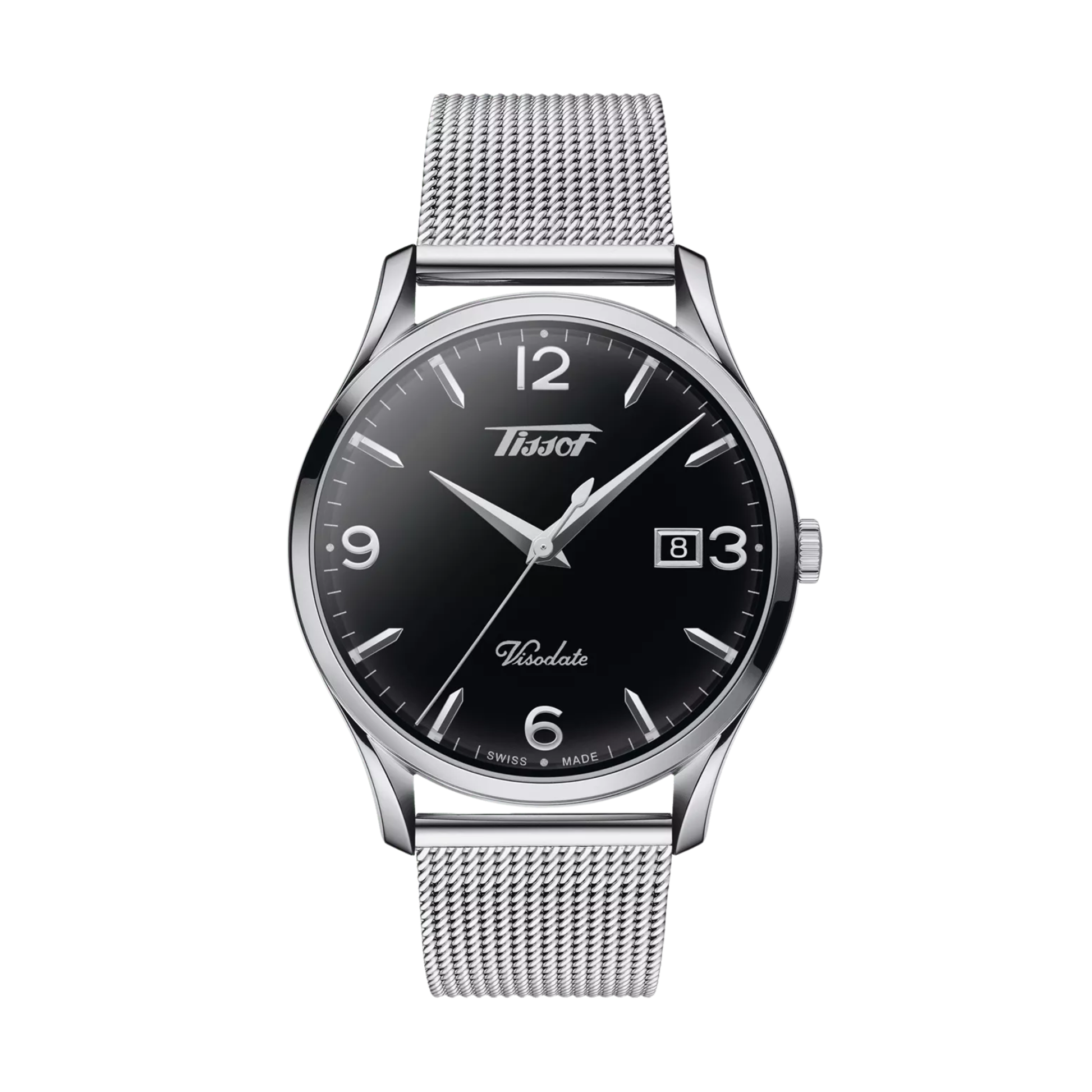 The Tissot Heritage Visodate Quartz 40 mm Black Dial Stainless Steel Quartz Watch is a tribute to the golden era of watchmaking, when style met simplicity in perfect harmony. Inspired by Tissot's 1950s designs, it carries forward the charm of the original Visodate, now paired with the convenience of modern quartz precision. The deep black dial is elegantly contrasted with polished silver-tone markers, while the classic date window nods to the model's heritage as one of Tissot's first date display watches. Housed in a sleek stainless steel case and secured with a matching bracelet, the watch offers a refined yet versatile look that works effortlessly from day to night. Protected by scratch-resistant sapphire crystal, this timepiece blends vintage soul with everyday practicality, making it a timeless companion for those who appreciate heritage with a modern edge. Identified by SKU: T1184101105700.
