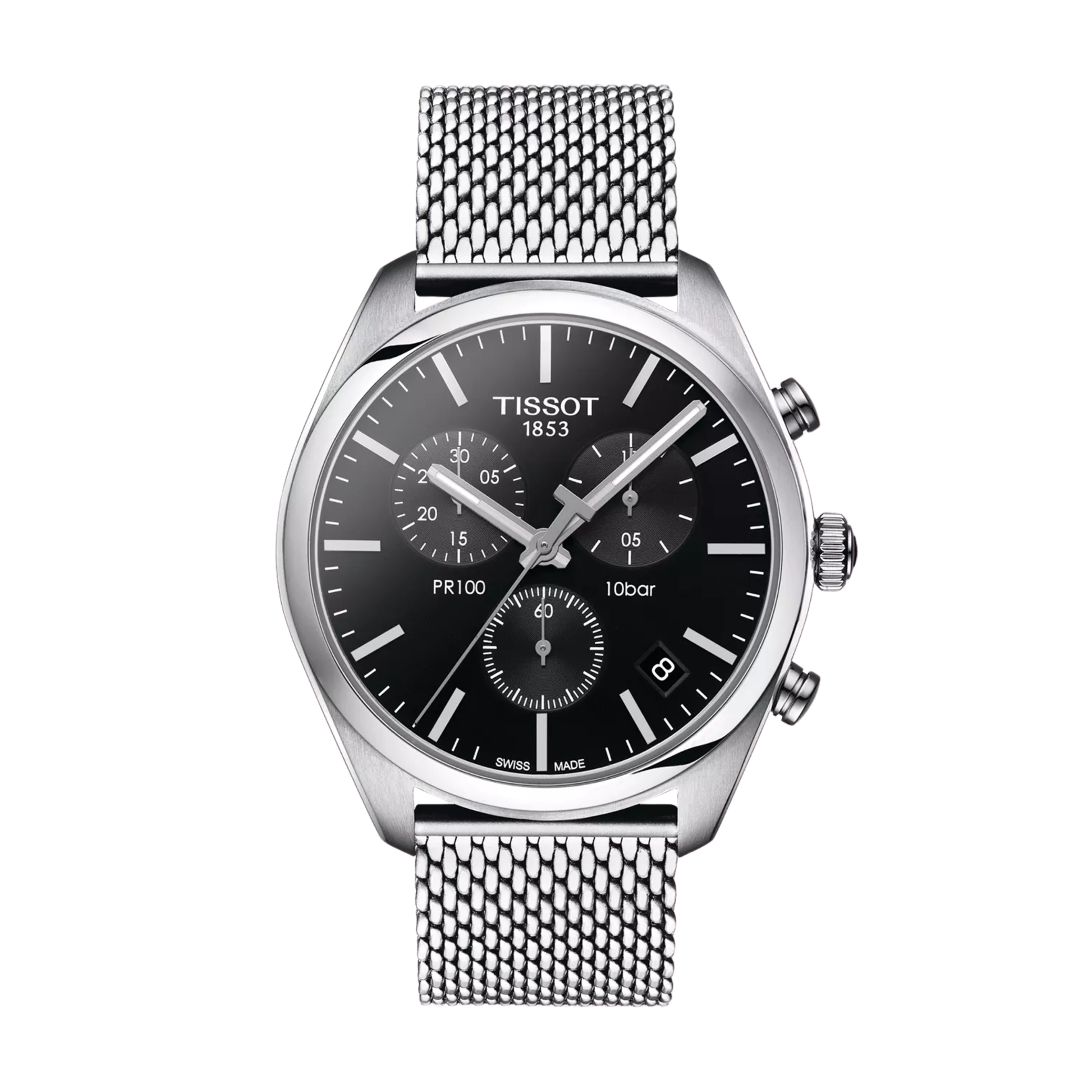 The Tissot PR 100 Chronograph 41 mm Black Dial Stainless Steel Quartz Watch blends classic style with everyday sport functionality. Its sleek black dial is accented by three chronograph sub-dials, providing precise timing for everything from workouts to workdays. Polished stainless steel hour markers and hands ensure excellent legibility, while the robust stainless steel case and bracelet give it a versatile, refined look that transitions seamlessly from casual wear to more formal settings. Powered by a reliable Swiss quartz movement, the PR 100 delivers accurate timekeeping with minimal maintenance. The chronograph function adds practicality, while the scratch-resistant sapphire crystal protects the dial for lasting clarity. Built for durability yet designed with timeless elegance, the PR 100 Chronograph is the ideal companion for those who want a watch that works as hard as they do‚ every day, in every moment. Identified by SKU: T1014171105101.