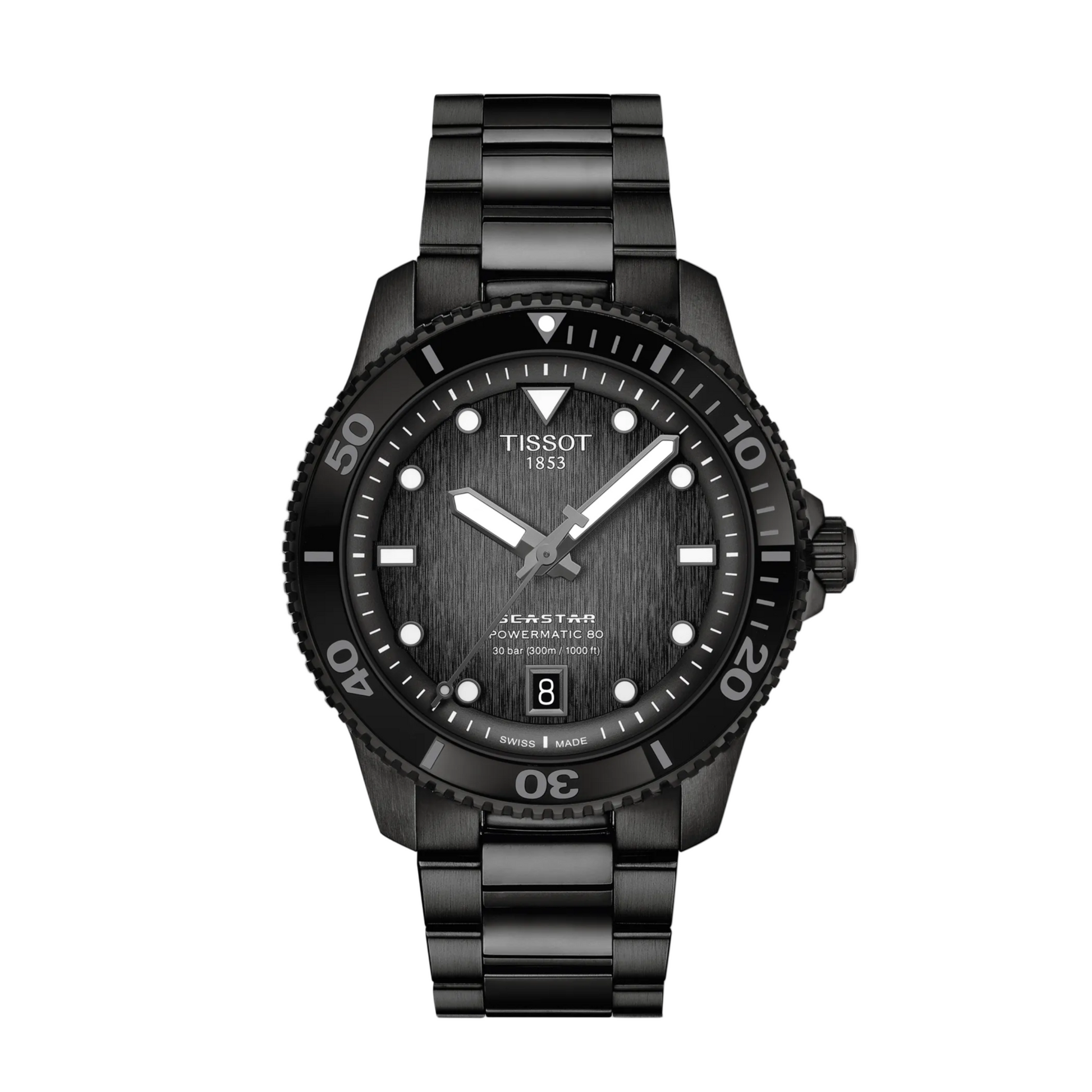 The Tissot Seastar 1000 Powermatic 80 40 mm Graded Grey Black Dial Black PVD Stainless Steel Automatic Watch is built for those who embrace both adventure and style. Its graded grey-to-black dial captures the depth and mystery of the ocean, while bold luminous markers ensure clarity in any light. The robust black PVD stainless steel case offers a sleek yet rugged look, complemented by a unidirectional bezel for precise dive timing. Inside, the Powermatic 80 automatic movement provides Swiss accuracy and an impressive 80-hour power reserve, so it is ready whenever you are. Water-resistant up to 300 meters, this watch is engineered for serious diving while remaining refined enough for everyday wear. The Seastar 1000 is more than a dive instrument‚ it is a reliable companion for exploration, delivering performance and sophistication in equal measure. Identified by SKU: T1204103305100.
