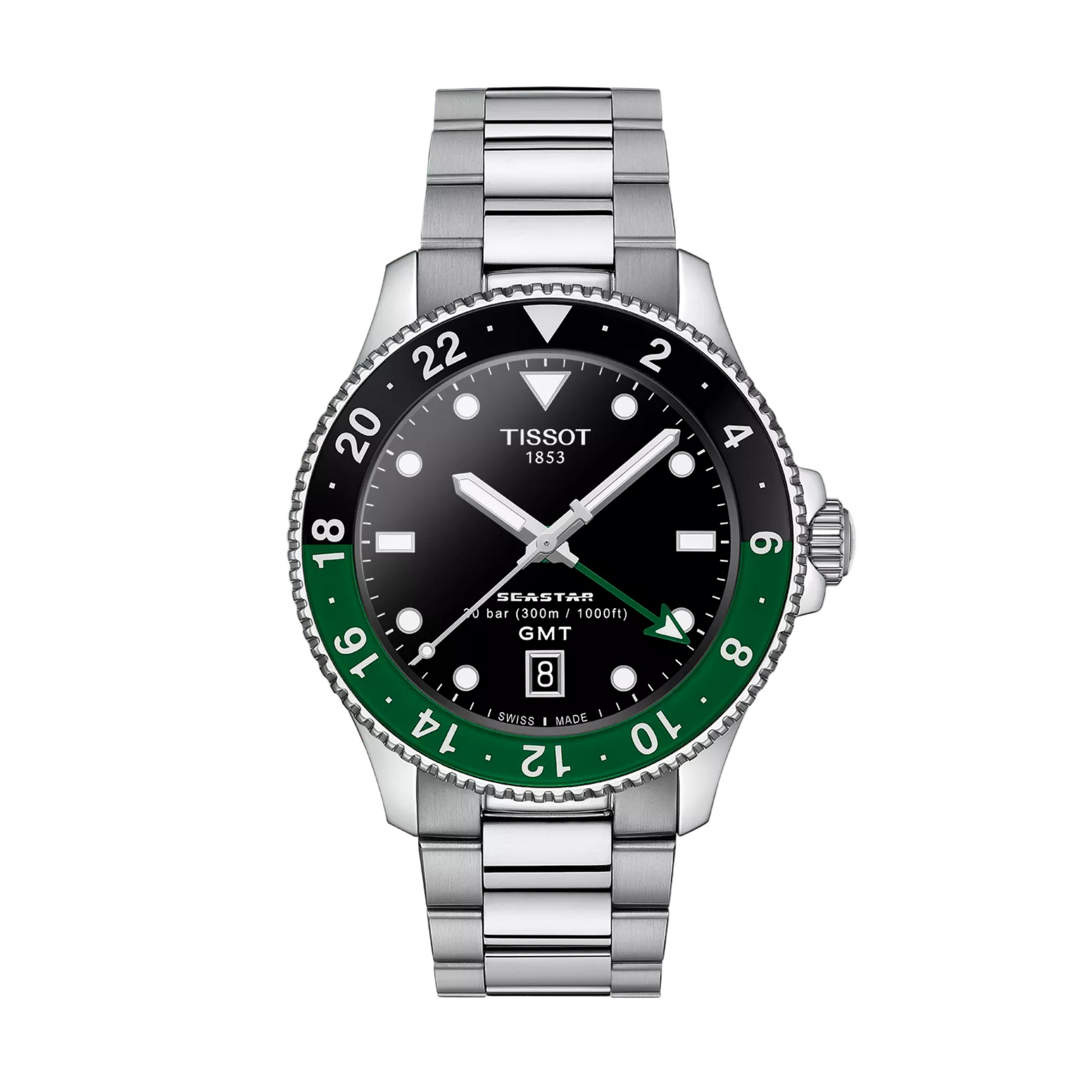 The Tissot Seastar 1000 GMT 40 mm Black Dial Stainless Steel Quartz Watch is built for those whose days are measured in adventures, not hours. Imagine the deep, endless blue of the ocean beneath you as you dive in, your watch keeping flawless time in two different zones‚ one for where you are, one for where your heart belongs. Its bold black dial, accented with a striking GMT hand, is housed in a robust stainless steel case that's ready for depths up to 300 meters. Whether you're underwater or on dry land, the luminous markers shine clearly, ensuring legibility even in the most challenging conditions. Powered by precise Swiss quartz movement, the Seastar 1000 GMT delivers reliability you can depend on, whether navigating tides or international flights. The unidirectional rotating bezel keeps your dive times in check, while the sturdy stainless steel bracelet offers durability with a polished edge of sophistication. This is more than a diver's GMT sport watch‚ it's a passport to exploration, a reminder that the world is vast, and your time is yours to own. Identified by SKU: T1208521105100.